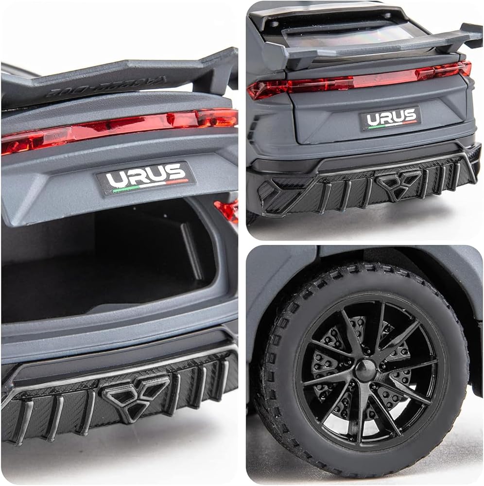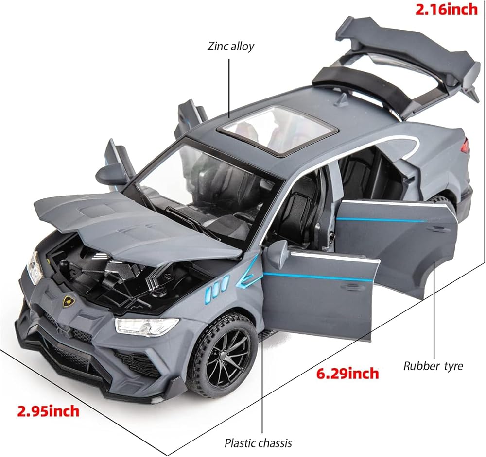 Function:Pull back model car,engine sound and light.Press the two wheels of the front car to trigger the engine sound and lights,and open the door to trigger the lights of the front and rear lights. Place the car on the ground,hold down the car body and pull it back,the model car will drive forward.