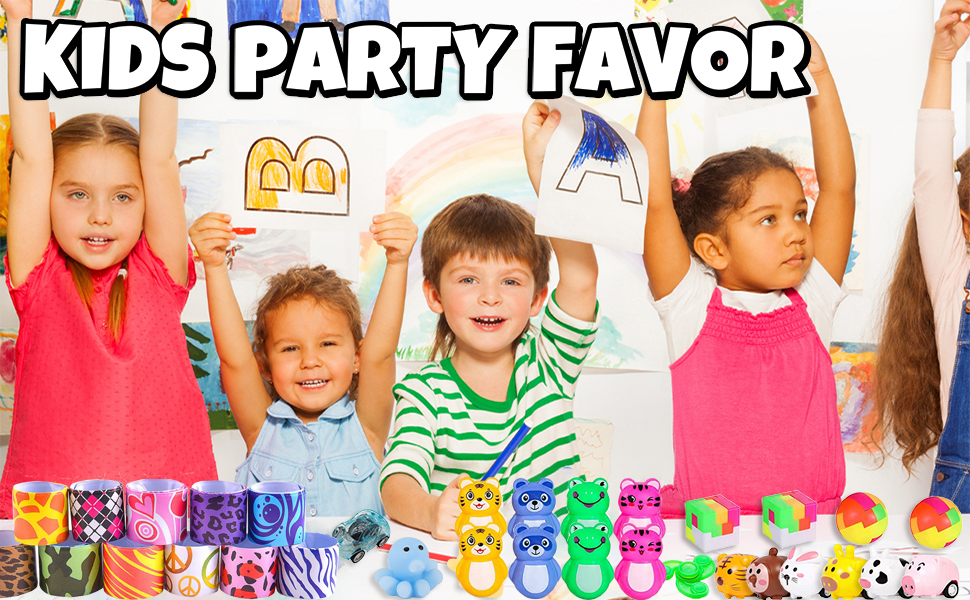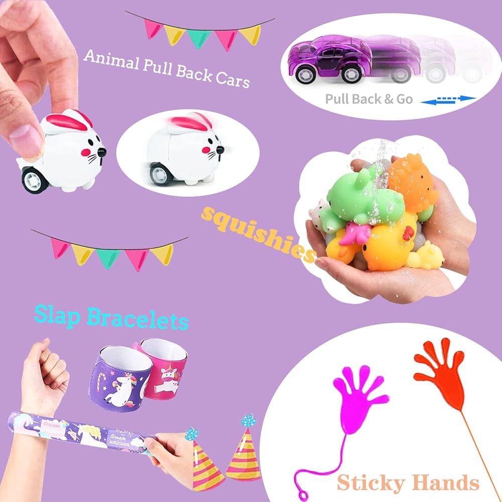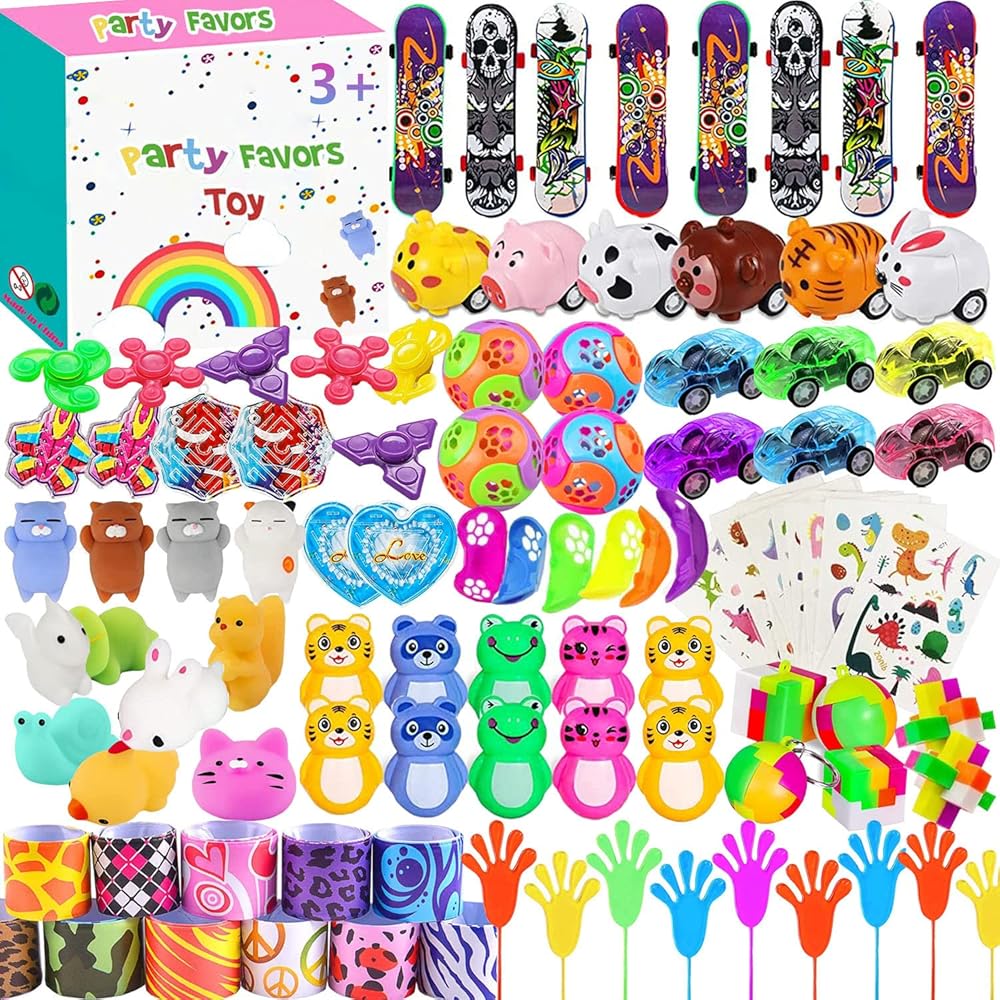 Party Favors Assortment for Kids: 100 pcs party favors include 10 Slap Bracelets, 10 Mochi Squishy Toys, 10 Puzzle Balls, 10 Finger Gyro, 10 Tumbler Toys, 12 Sticky Hands, 6 Maze Puzzles, 10 Finger Skateboards, 6 Pull Back Cars, 6 Animal Pull Back Cars, 10 Temporary Tattoos.