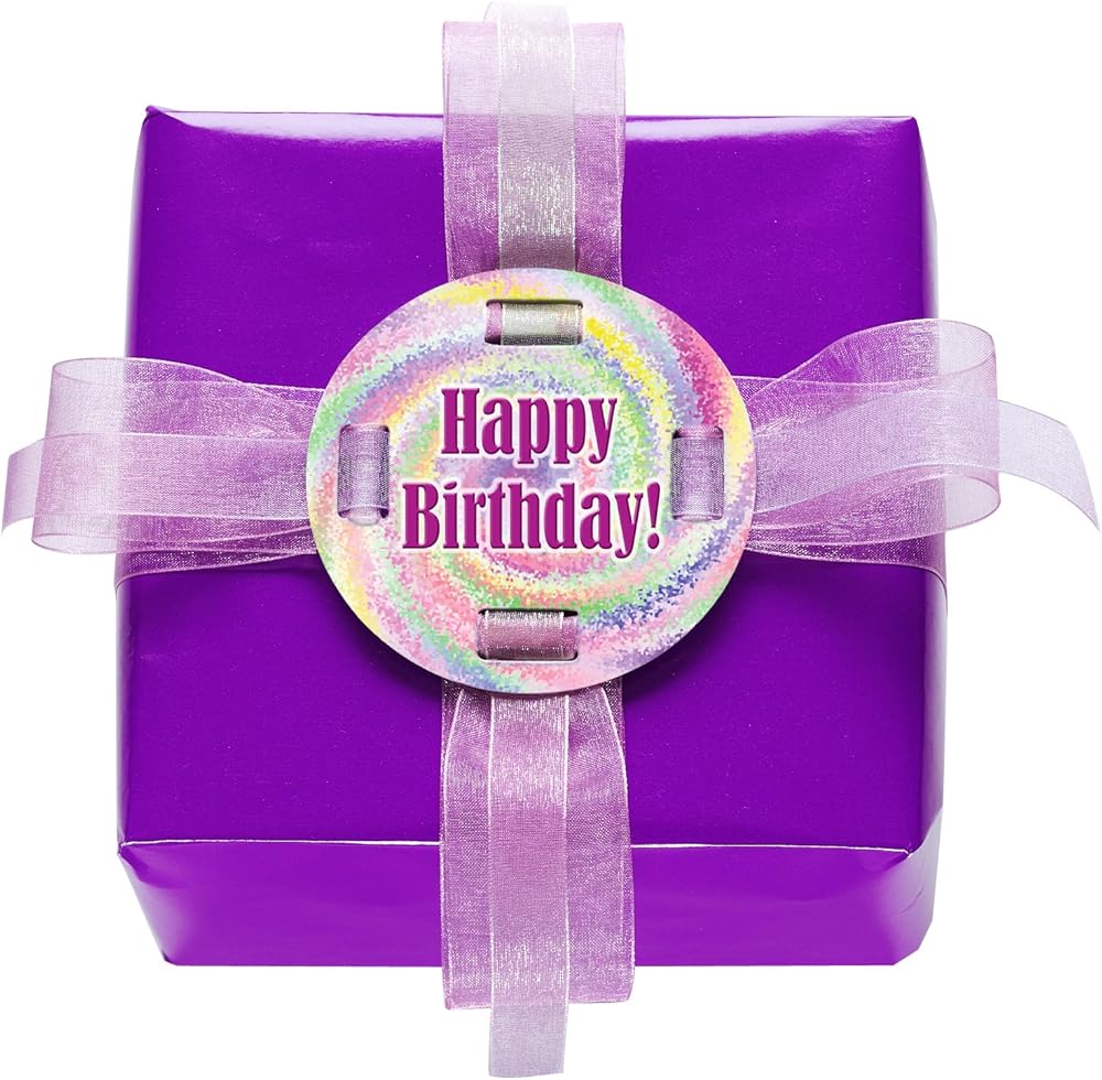 Fobbie gift wrap tags are 3.5 inches round and a 1/16" thick. They are glossy printed on a durable, laminated card stock, with our patented slot system for threading two ribbons around your gift and cinching in place.