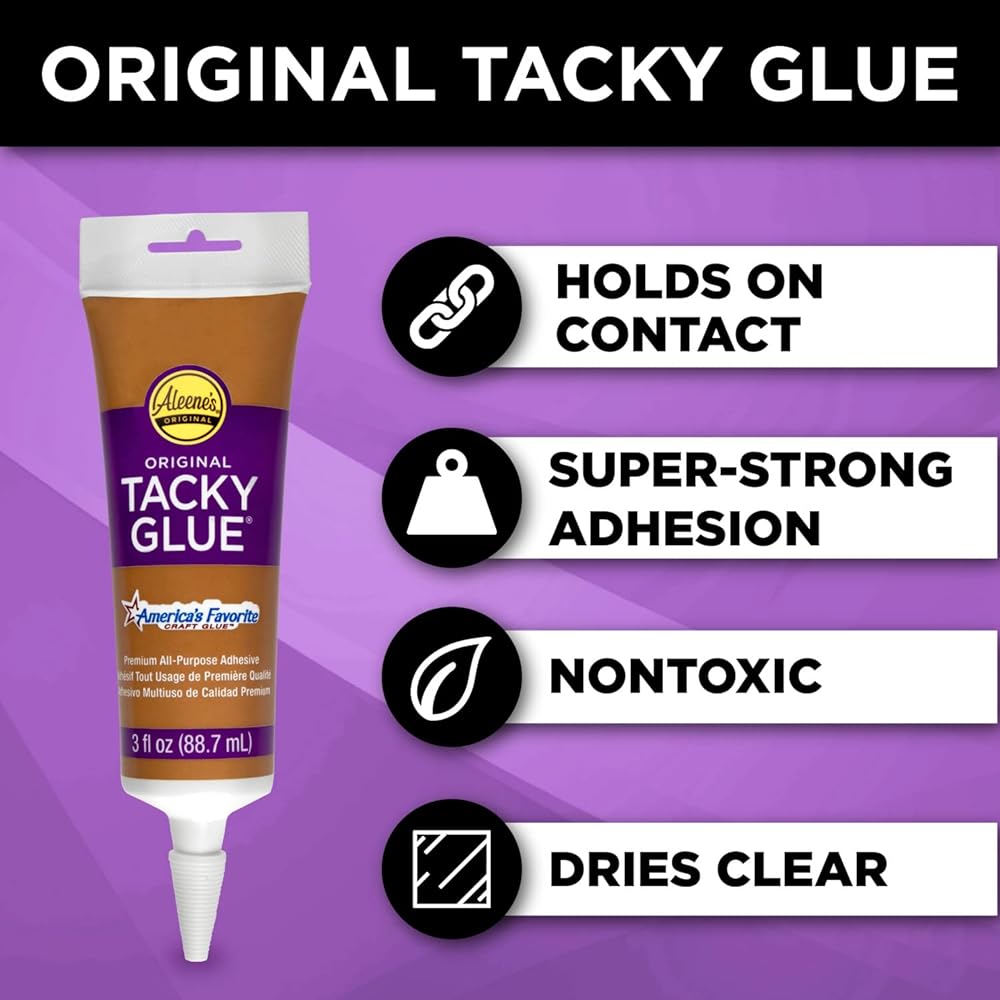 There's a reason this glue has been around for over 70 years! One of the most trusted all-purpose adhesives you can find, Original Tacky Glue works on just about every surface. Its thick, nontoxic tacky formula grabs items on contact and dries super strong, permanent, and clear, making it great for crafts, hobbies, DIYs and household repairs. Features 1 (3 fl. oz.) tube of Aleene's Original Tacky Glue.