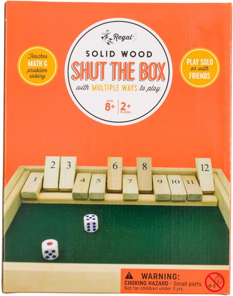 ALL IN ONE SET: The Regal Games Shut The Box 12 Spot Game comes with everything you need to have a good time, including a wooden box with green felt and 2 dice for two or more players
