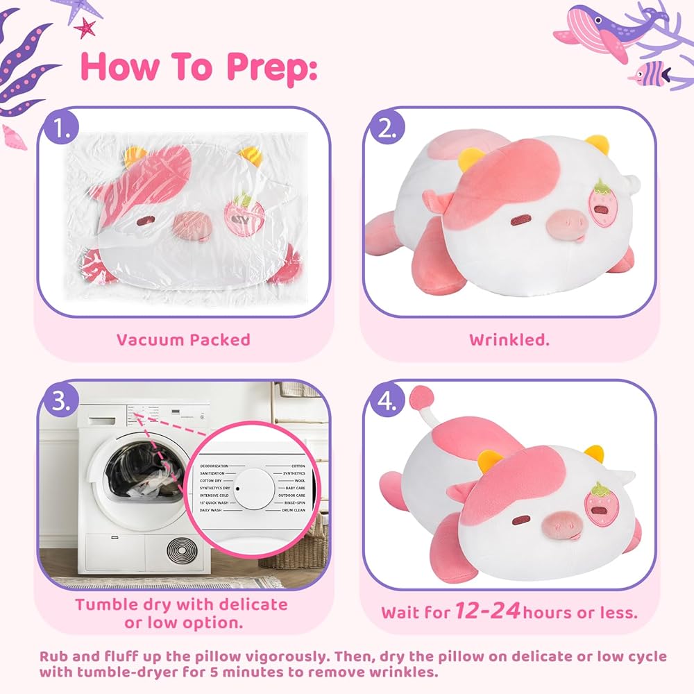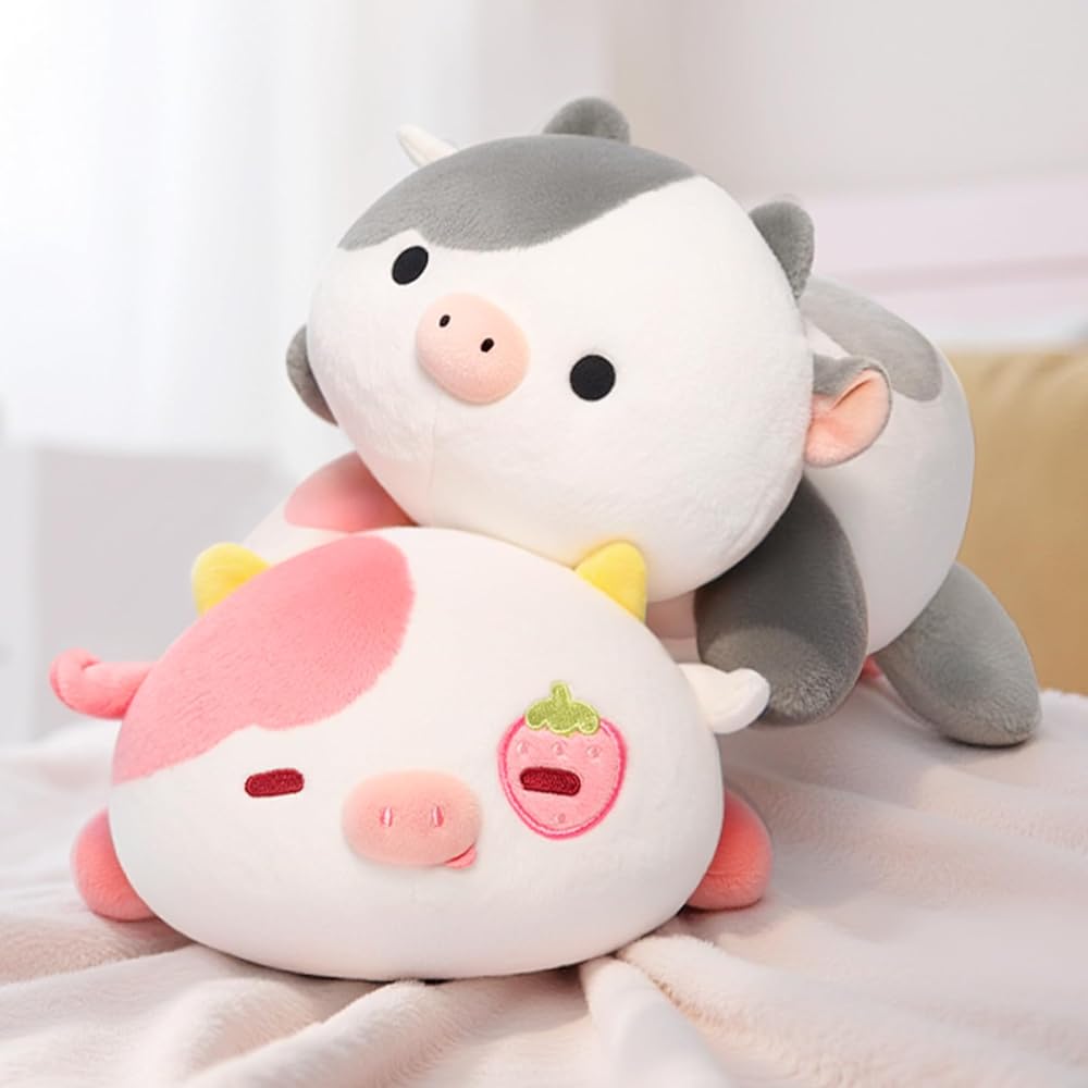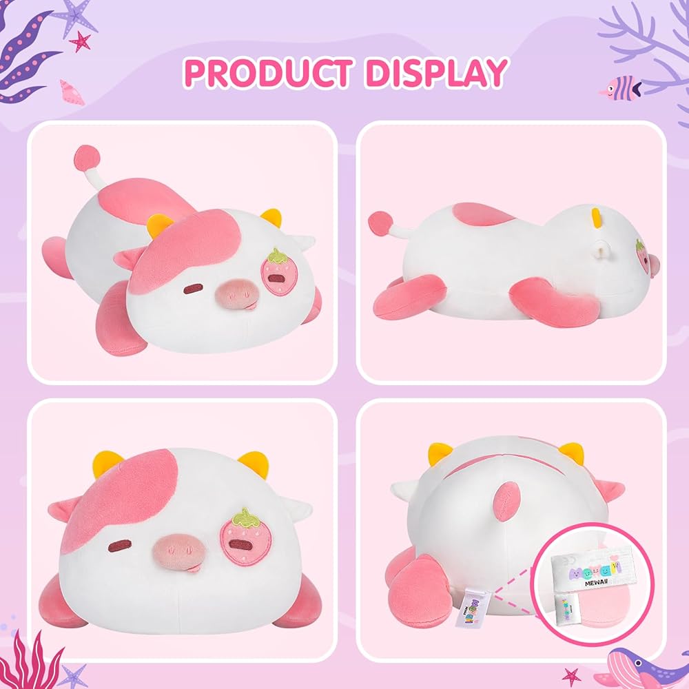 Soft Cute Pillow: Mewaii Strawberry Cow Strawberry Cow plush pillow combines high-quality fabric, elastic fibre and good stitching to provide you with the best cuddling sense. Filled with elastic soft fibre, it has a delicate feel and comfortable. Whether from touch or sight, the cute plush pillow can make you feel cozy after a stressful work or study.