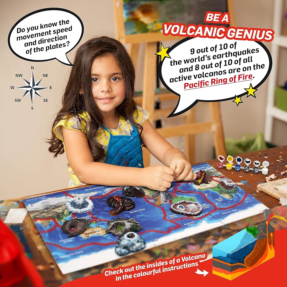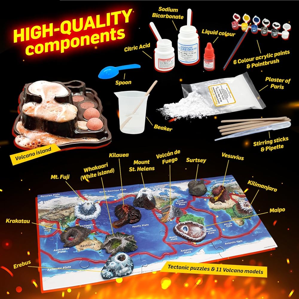 Create volcanos, observe chemical reactions, build a tectonic map and learn about volcanology with this volcano science kit! Children aged 8+ will make 11 world famous volcanos and learn about the history of each one. Complete the Tectonic Puzzle to see how tectonic plates cause volcanic activity. Children can also place their volcanoes on the completed map to learn about the Pacific Ring of Fire. Use chemical reactions to create eruptions, lava bombs and mineral pools. Foster STEM and creativity skills as children use the included paints to customize each volcano. This science kit includes safe, high-quality ingredients, safety equipment and a full-color education and instruction booklet which includes detailed, step-by-step illustrations that are easy for children to understand. Adult supervision is recommended. || For ages 8+.