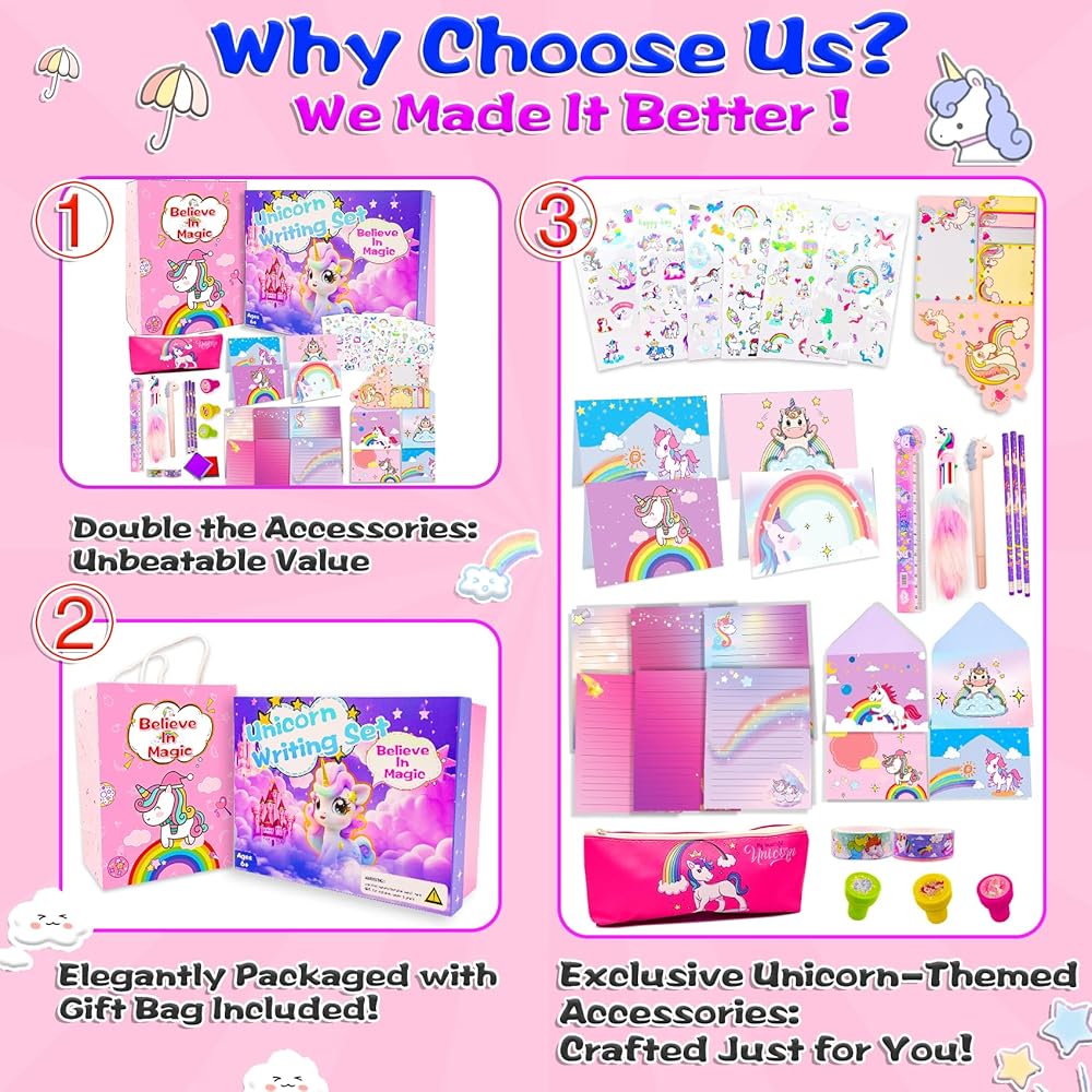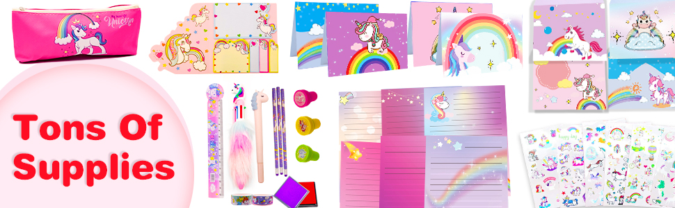 【MEGA PACE – MORE THAN 200 PCS】The unicorn stationary set boasts over 200 unicorn-themed writing supplies, twice the quantity compared to other sets