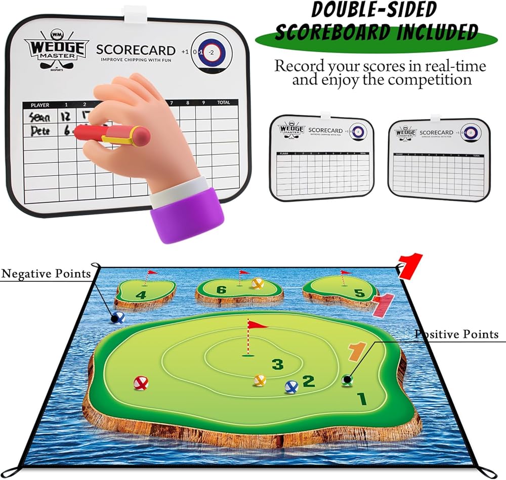 COMPETITIVE FUN - The chipping mat can be hung or placed flat on the floor, players take turns aiming their chips to land on the designated scoring area, with the highest cumulative score winning. Join the competition, more rules of the game for you to create.