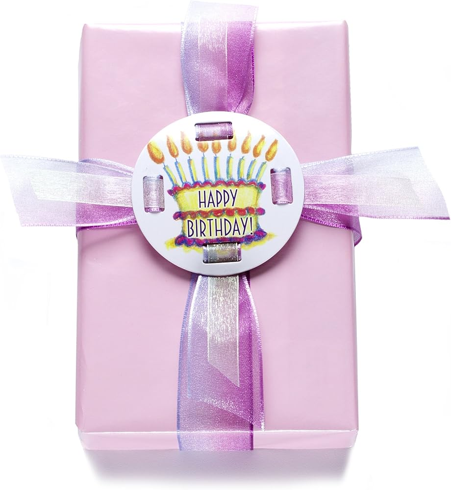 Fobbie gift wrap tags are 3.5 inches round and a 1/16" thick. They are glossy printed on a durable, laminated card stock, with our patented slot system for threading two ribbons around your gift and cinching in place.