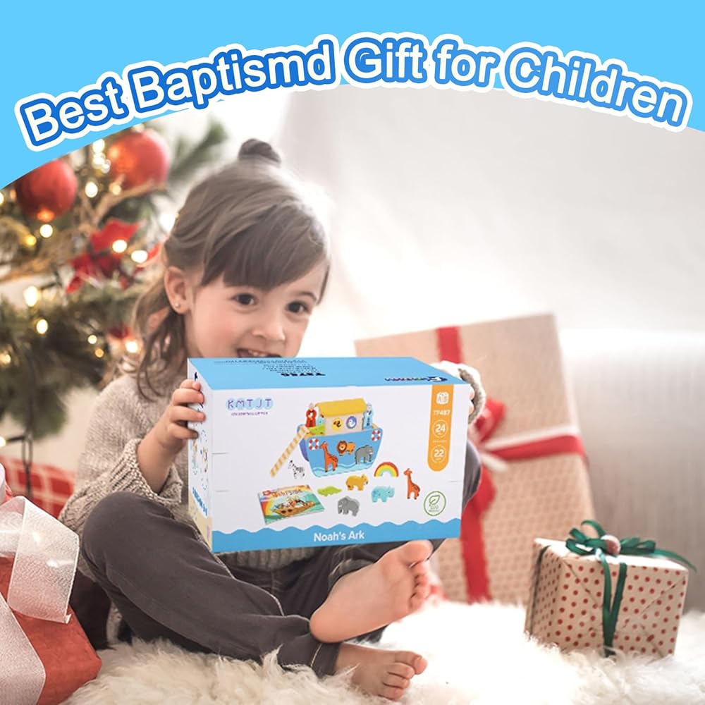 KMTJT Toddlers Wooden Noah's Ark Toy Animal Playset, Baptism Gifts for 1 2 3 Boys Girls, Shape Sorter Early Learning Montessori Toys with Bible Story Book for 12 18 24 Months Babies