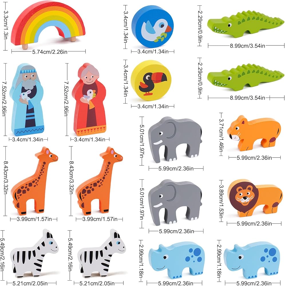 【Noah's Ark Playset】This Noah's Ark toy Includes 1 ark, Noah and his wife, 2 zebras, 2 elephants, 2 rhinos, 2 crocodiles, 2 lions, 2 giraffes, 2 birds, 1 boarding ladder, 1 Noah storybook, 1 rainbow. Thick and durable wooden blocks, sized for toddlers. Noah's Ark Wooden Toys will give your child endless fun of imagination and creativity.