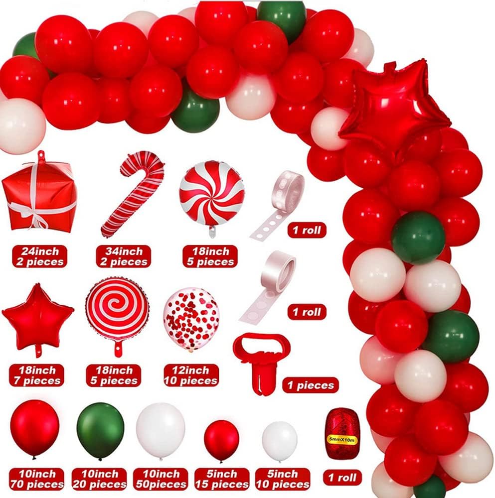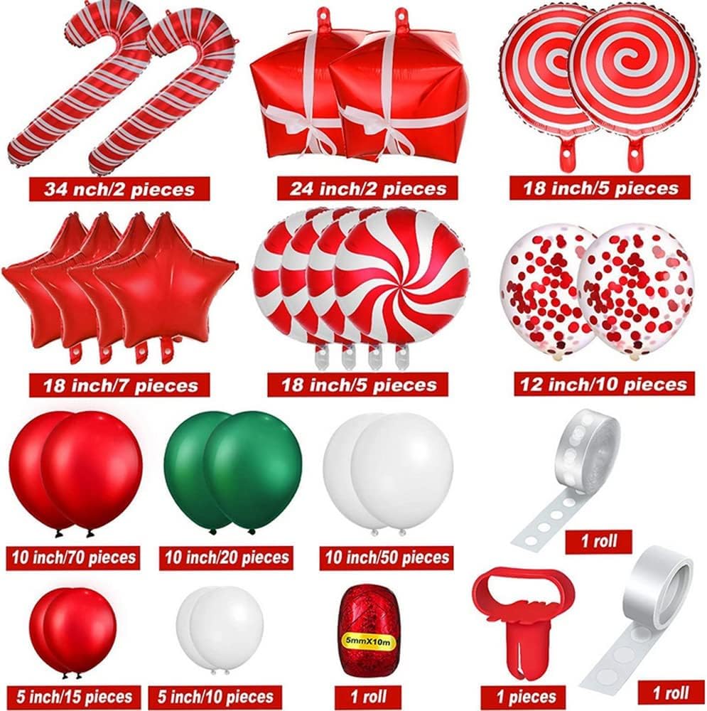 【Christmas Decorations Packaging Includes】200pcs Christmas balloons include: 20pcs 10inch green balloons, 85pcs red balloons (70pcs 10inch and 15pcs 5inch), 60pcs white balloons (50pcs 10inch and 10pcs 5inch),10pcs 12inch Sequin balloons , 2pcs 24inch gift box balloon, 2pcs 34inch candy hand account balloon, 5pcs 18in candy balloons, 5pcs 18inch Cane balloons , 7pcs 18in star balloons, 1pcs tying tool, 1pcs silver ribbon, 1pcs 100 glue points and 1rolls balloon arch strip.