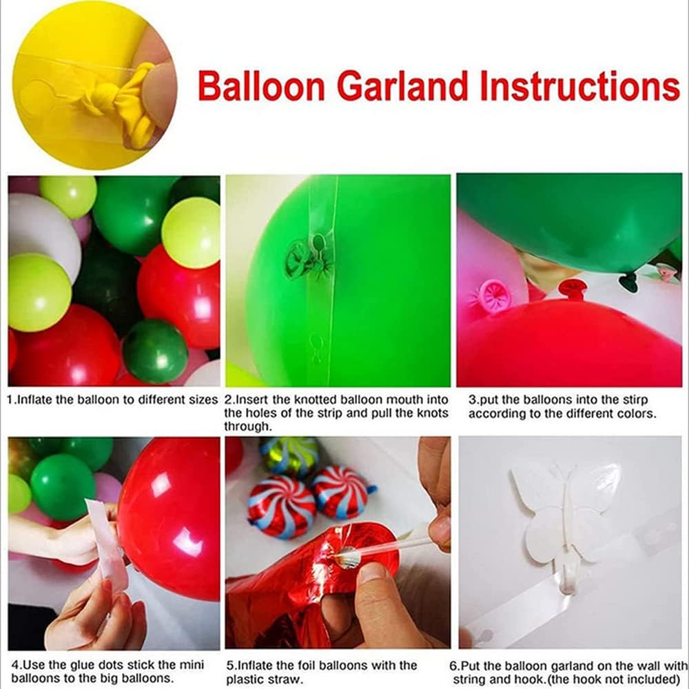 【Easy to assemble】we offer 5 tools including band, ribbon, adhesive dispense, balloon knotter, double-hole balloon chain.the first step is to blow up balloons of different shapes and sizes. the second step, insert them into the plastic garland-making strip. the third step, hang the balloon garland according to your favorite shape. In just 30 minutes you will get a beautiful Christmas balloon garland party background.
