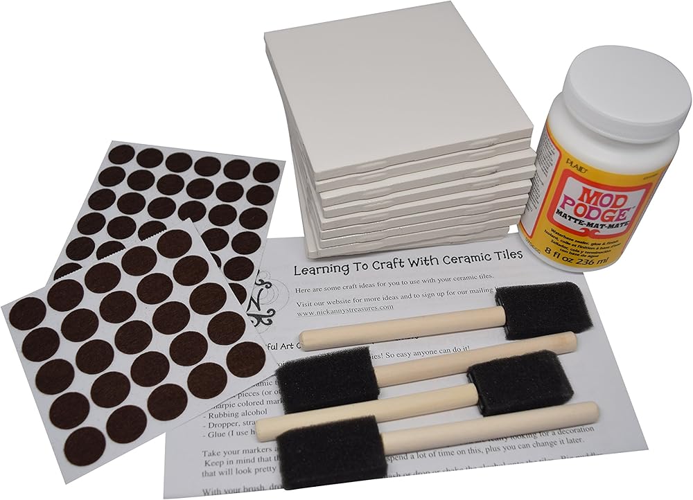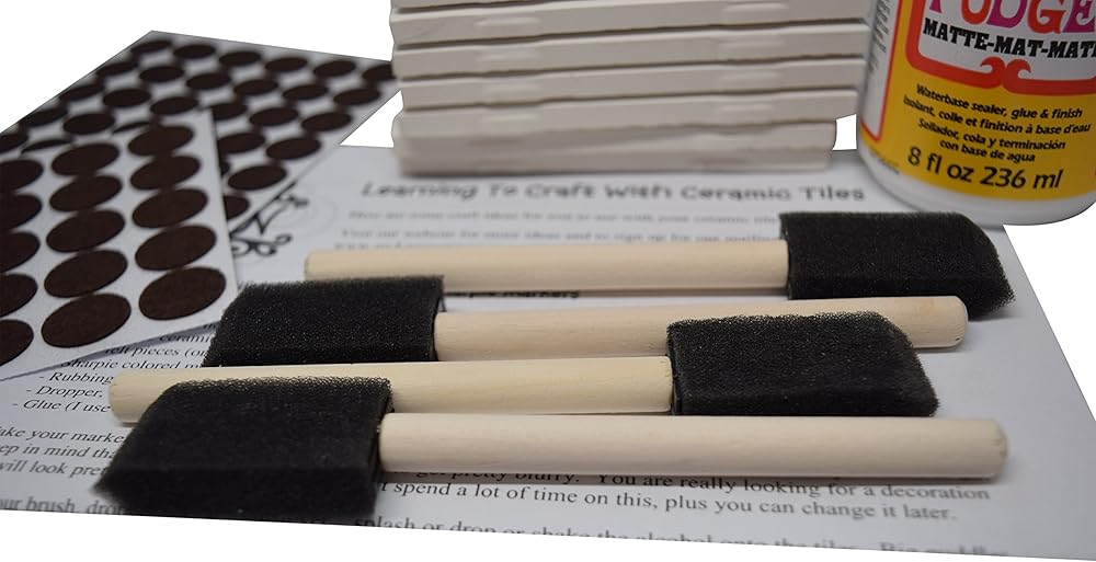 Kit includes 10 White tile, exclusive guide for how to create the project, mod podge (8 oz), craft sponge brushes (4) and an assortment of felt pads to use to protect the surface of your furniture