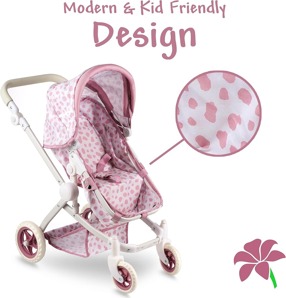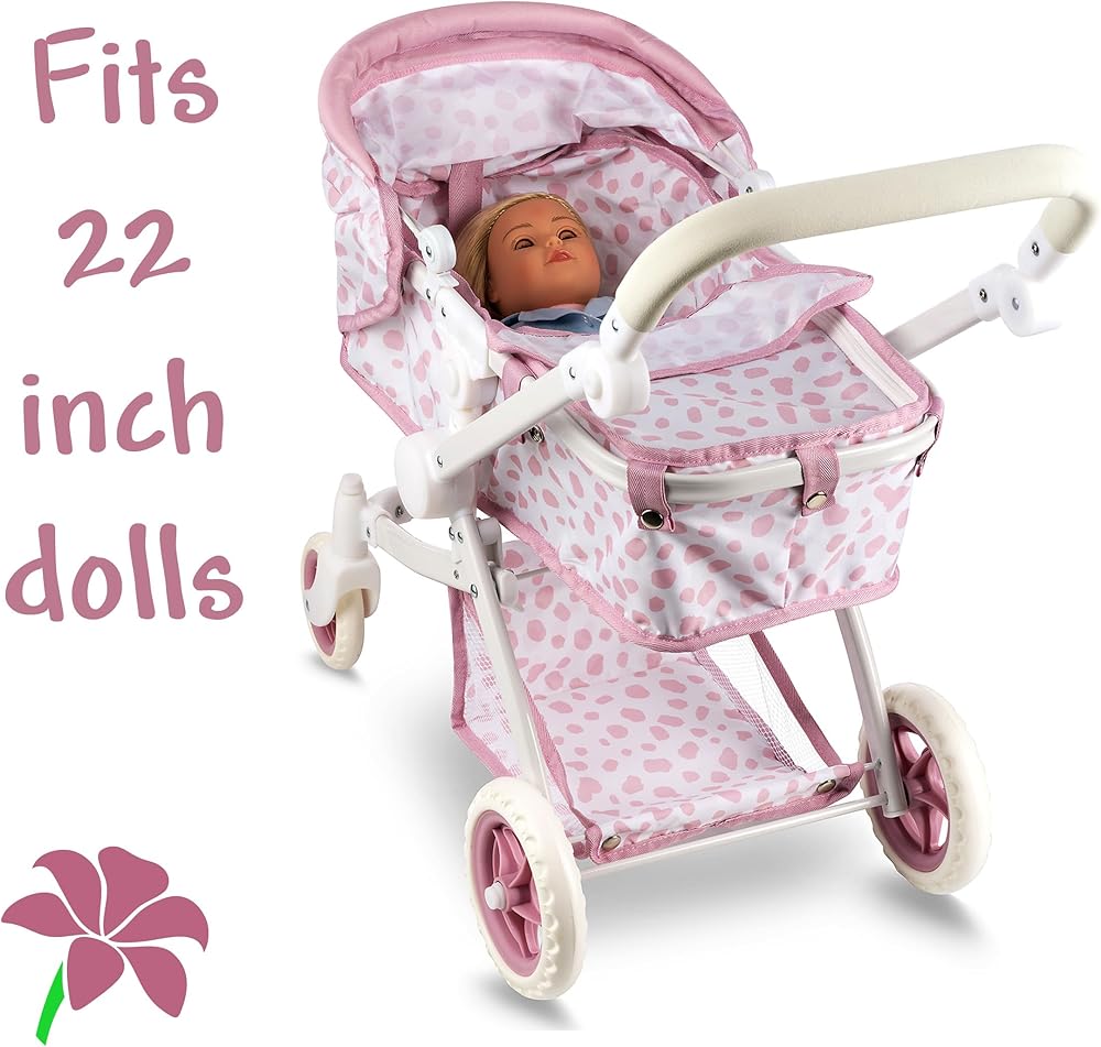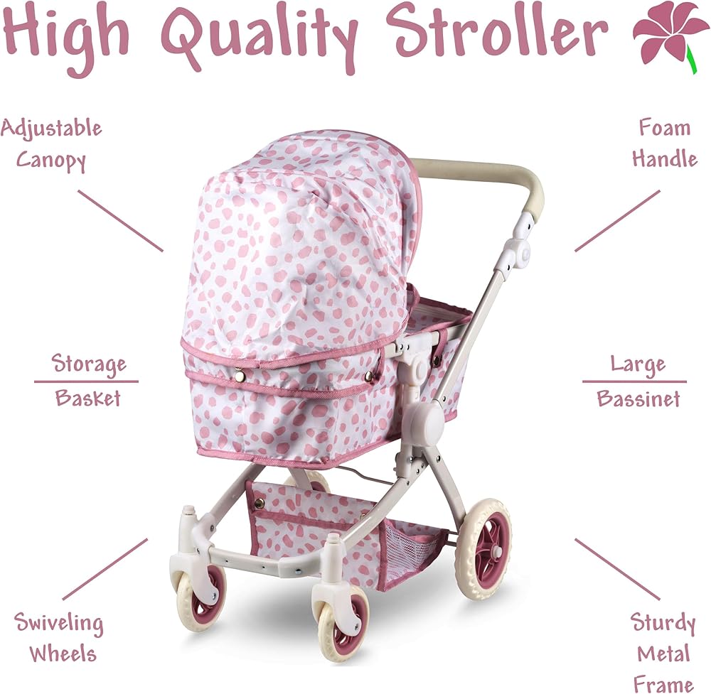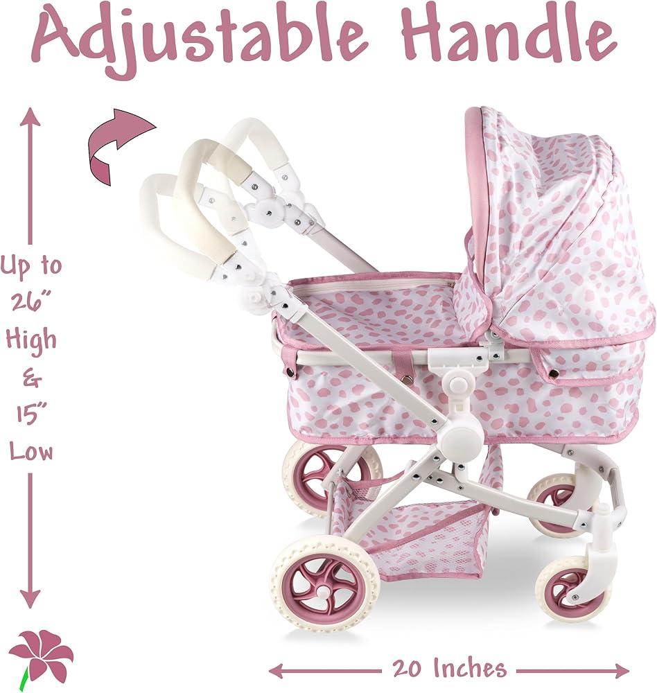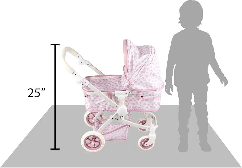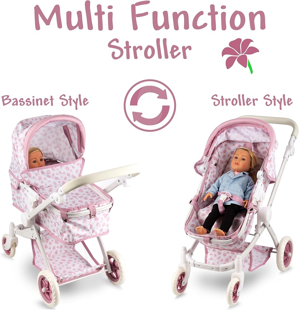 Convertible Baby Doll Stroller for Dolls - Bassinet Toy Buggy for Toddlers 3 Years and up, Adjustable Seat & Handle with Storage Basket, Pink Polka Dot Design for Kids