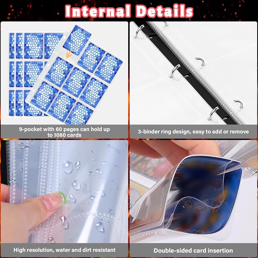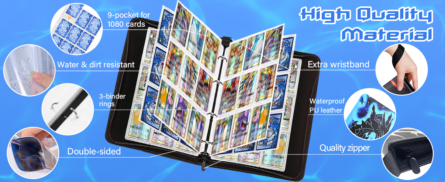 👀【LARGE CAPACITY - 1080 POCKETS】9 pockets double-sided card binder holds up to 1080 standard-sized transaction cards with 60 pages. The three-ring buckle is made of stainless steel, which is not easy to scratch the hand and is convenient to increase or reduce internal card sleeves. The pockets of the card binder are transparent so each card can be clearly seen. Made of acid-free, non-PVC material, the high clarity trading card binder prevents cards from fading, getting dirty or wet.