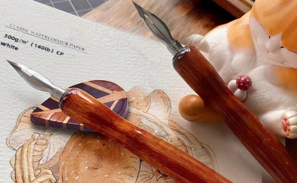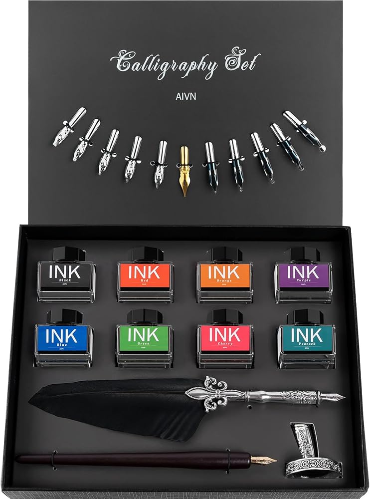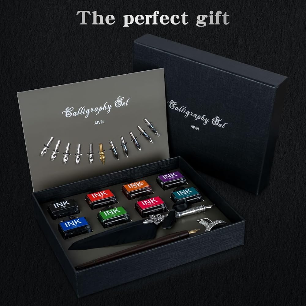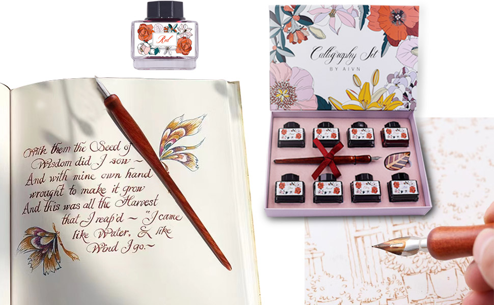 Perfect Calligraphy Set for Calligraphy and Comic Drawing Lovers. Calligraphy Kit for Beginners. The Wooden Dip Pen Set is equipped with 12 different stainless steel pen nibs and 8 bottles of gorgeous color inks. Rosewood pen and leaf style wood pen holder together form an exquisite dip pen set gift box.