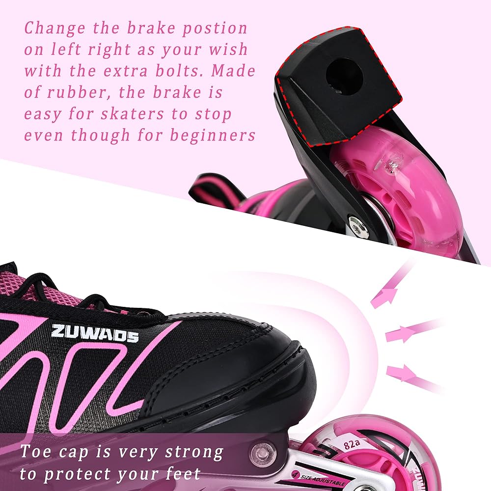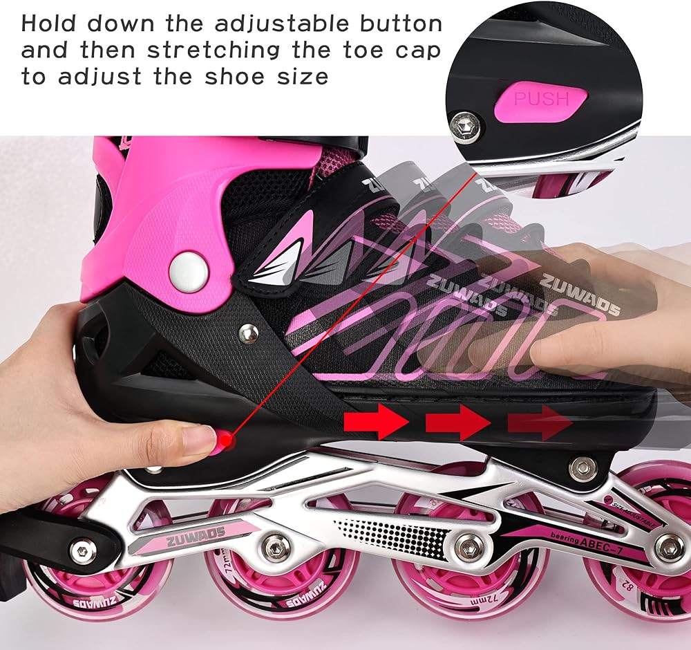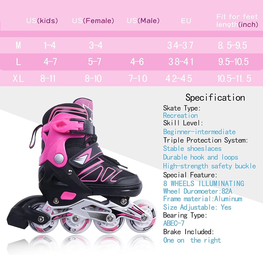 4 ADJUSTABLE SIZES inline skates : With just one button, you can easily adjust the size. Our roller skates are available in four sizes S / M / L / XL, each with a button to adjust the length.Please make sure to choose the correct size via checking enclosed size chart pictures.