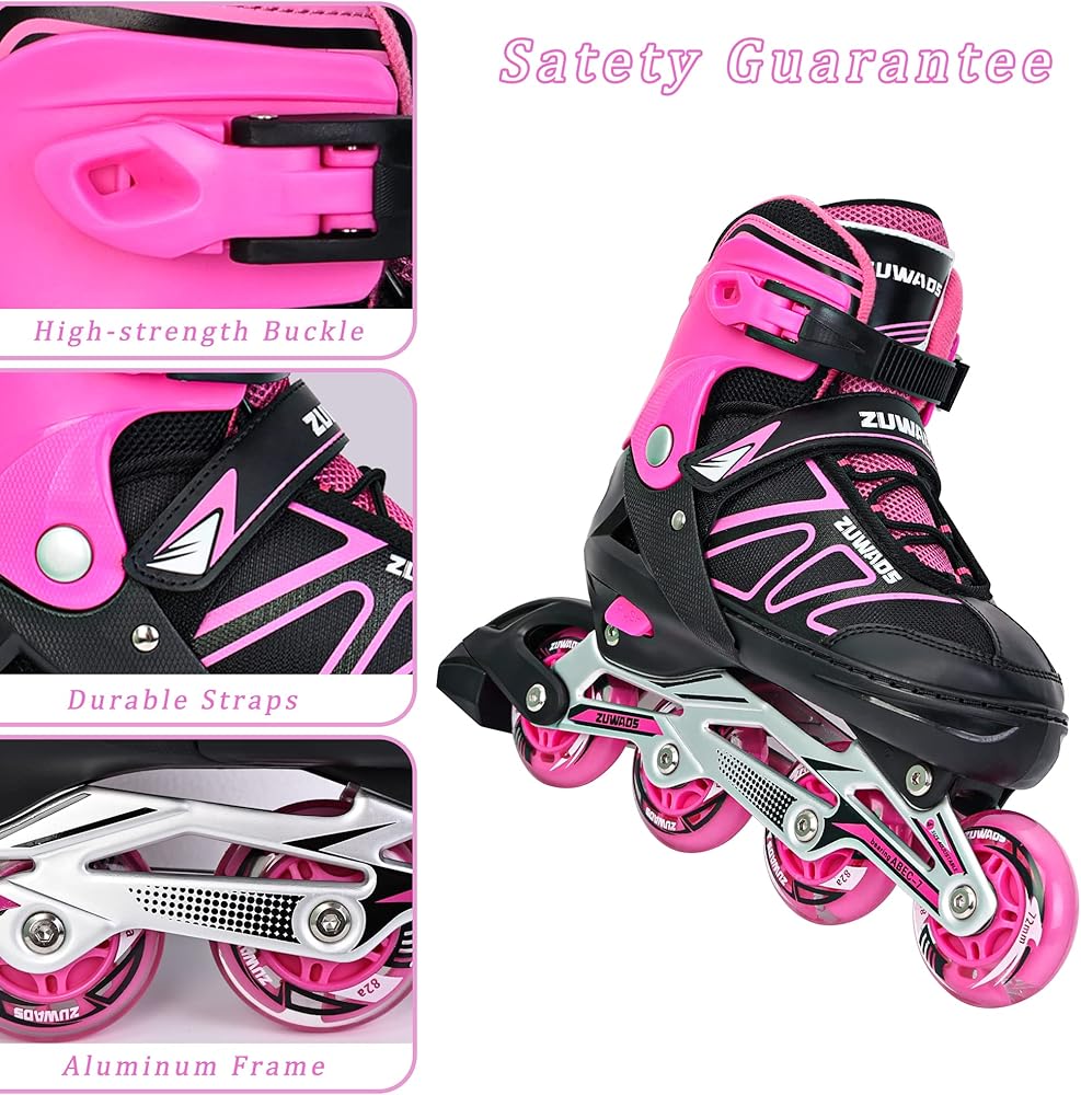 SAFETY and COMFORT - Our kids inline skates have triple protection system, Includes Cam lever buckles, strap and laces. The aluminum alloy frame provides safe ankle support and the inner boot is breathable, bring you unprecedented comfortable feeling.Besides,the liner is designed to improve the skating experience with strategically shaped and placed pads. This cradles the feet in comfort and reduces foot fatigue for longer more enjoyable skating.