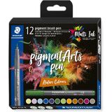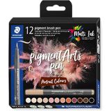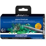 Discover the world of intense, brilliant colours with STAEDTLER's brand new Pigment Arts pen range. The range includes pigment brush pens, pigment soft brush pens, pigment calligraphy pens and the pigment pen. All pens from this assortment come with an innovative and outstanding new ink, the so called MULTI INK, which sets new standards regarding colour brilliancy and lightfastness. An extension to STAEDTLER's popular Pigment Liner range, the Pigment Arts range make drawings, illustrations, and lettering shine and are particularly suitable for many mixed media techniques. The pens inspire all levels of experience, particularly hobby creative and professional users. The Pigment Brush Pen is a high-quality fibre-tip pen with a medium-firm brush nib that is really easy to control and makes it the perfect tool for all level of experiences. The stable nylon brush tip has the ideal balance between flexibility and firmness. The flexibility of the tip allows smooth thick, and thin transitions and the firmness to create more controlled linework. The elasticity of the nib ensures that after use the nib will get back into its original shape. Due to the medium-sized stable nylon brush tip and its ink flow, variable line widths can be created, and all sorts of applications are achievable, such as lettering, bullet journaling, illustrations, or manga. The Pigment Brush pen is also particularly well-suited for a combination of creative painting techniques, materials, and painting mediums. Available in up to 36 outstanding brilliant colours. The Pigment Brush Pen comes with the innovative and outstanding Multi Ink and its housing (cap, barrel & end cap) is made of 97% recycled plastic.