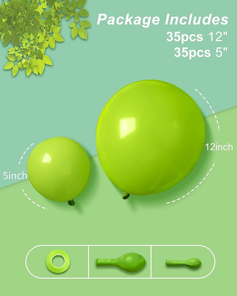 عبوة مناسبة للميزانية مقاس 30.48 سم + 5 سم: مجموعة بالونات سفاري معبأة في مجموعة مكونة من 70 بالونة، تحتوي على 35 قطعة مقاس 30.48 سم و35 قطعة بالون أخضر ليموني مقاس 12.7 سم وشريط ألوان مطابق. حجمان مختلفان من بالونات الغابة يساعدان على تشكيل قوس بالون مثالي وإكليل بالونات، مما يجعل حفلتك أو مأدبتك مميزة. استمتع بوقت الحفلة واصنع بعض الذكريات الجميلة التي لا تنسى.