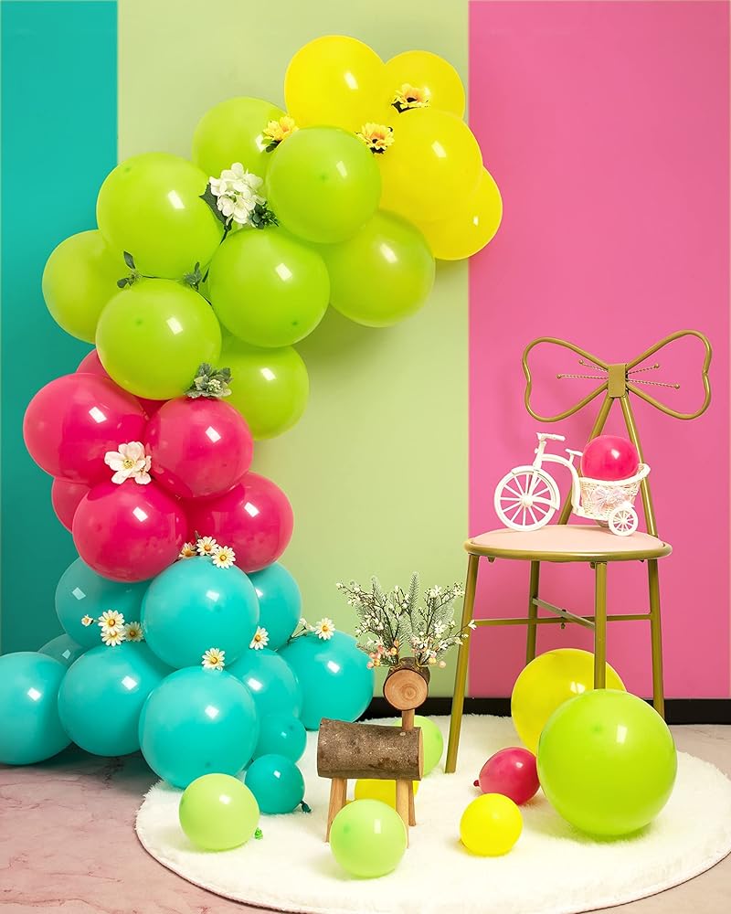 USER-FRIENDLY & LASTING BALLOONS: These lime green ballons different sizes are equipped with sufficient elasticity so that both air or helium easily inflate them. Hold about 1 to 2 days when birthday balloons are blown up by an air pump and 3-6 hours when filled with helium in party balloons. The number of well-matched balloons creates the perfect tropical garland arch.