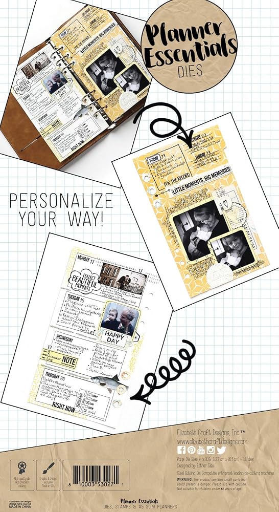 Spice up your next project with this die set. This package contains Planner Essentials: a set of 10 metal dies measuring between .75x1.5 inches and 5x8.25 inches. WARNING: Choking Hazard. Not suitable for children under 3 years. WARNING: May contain items