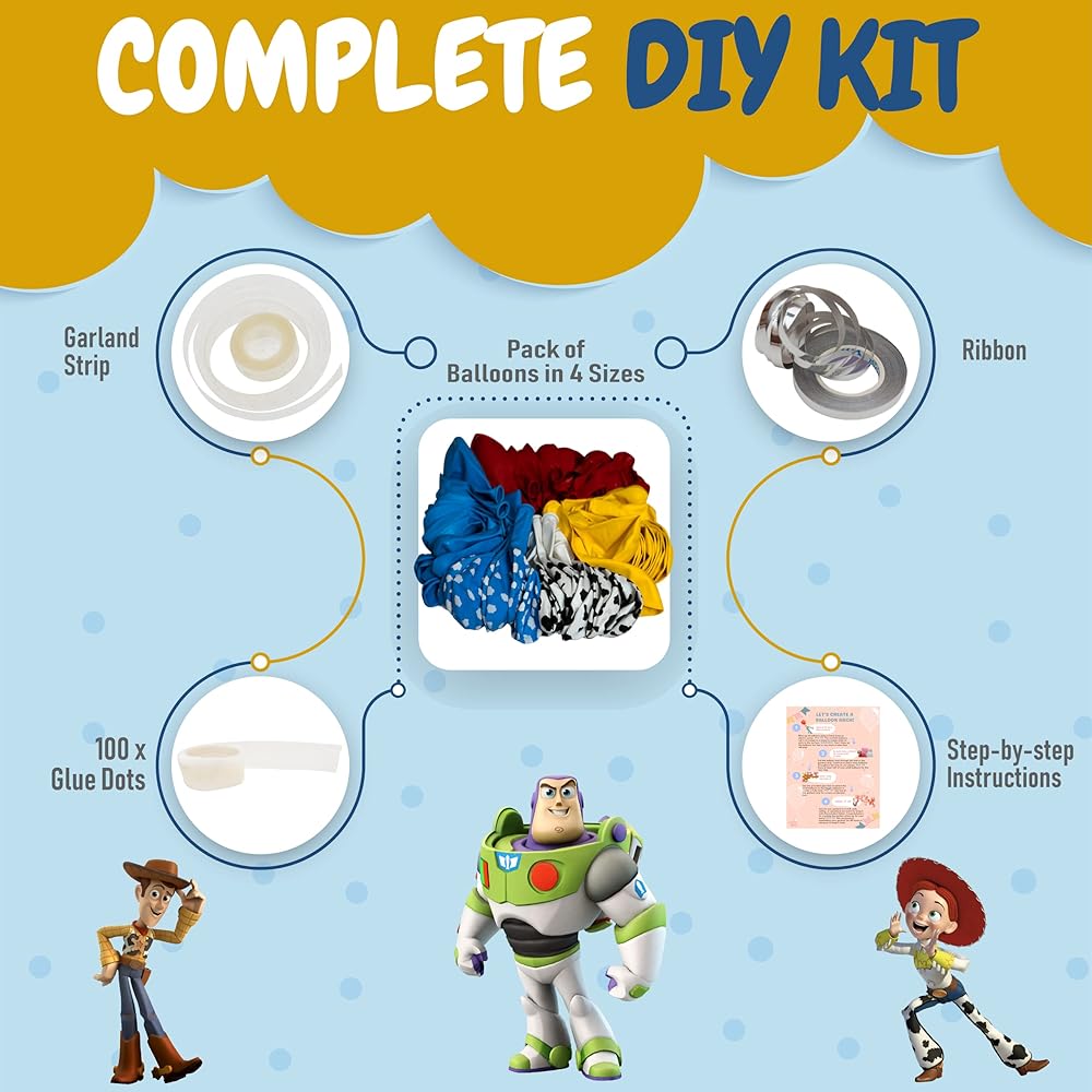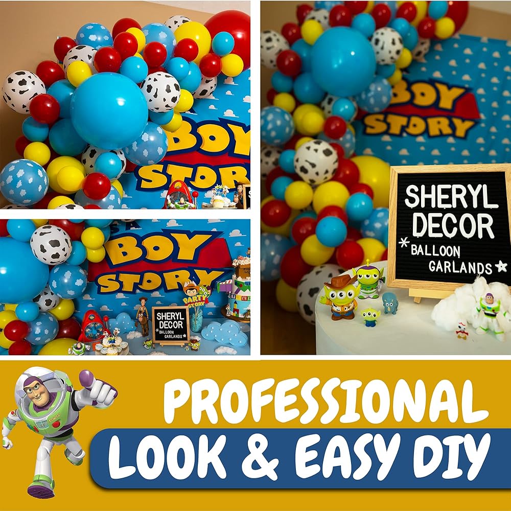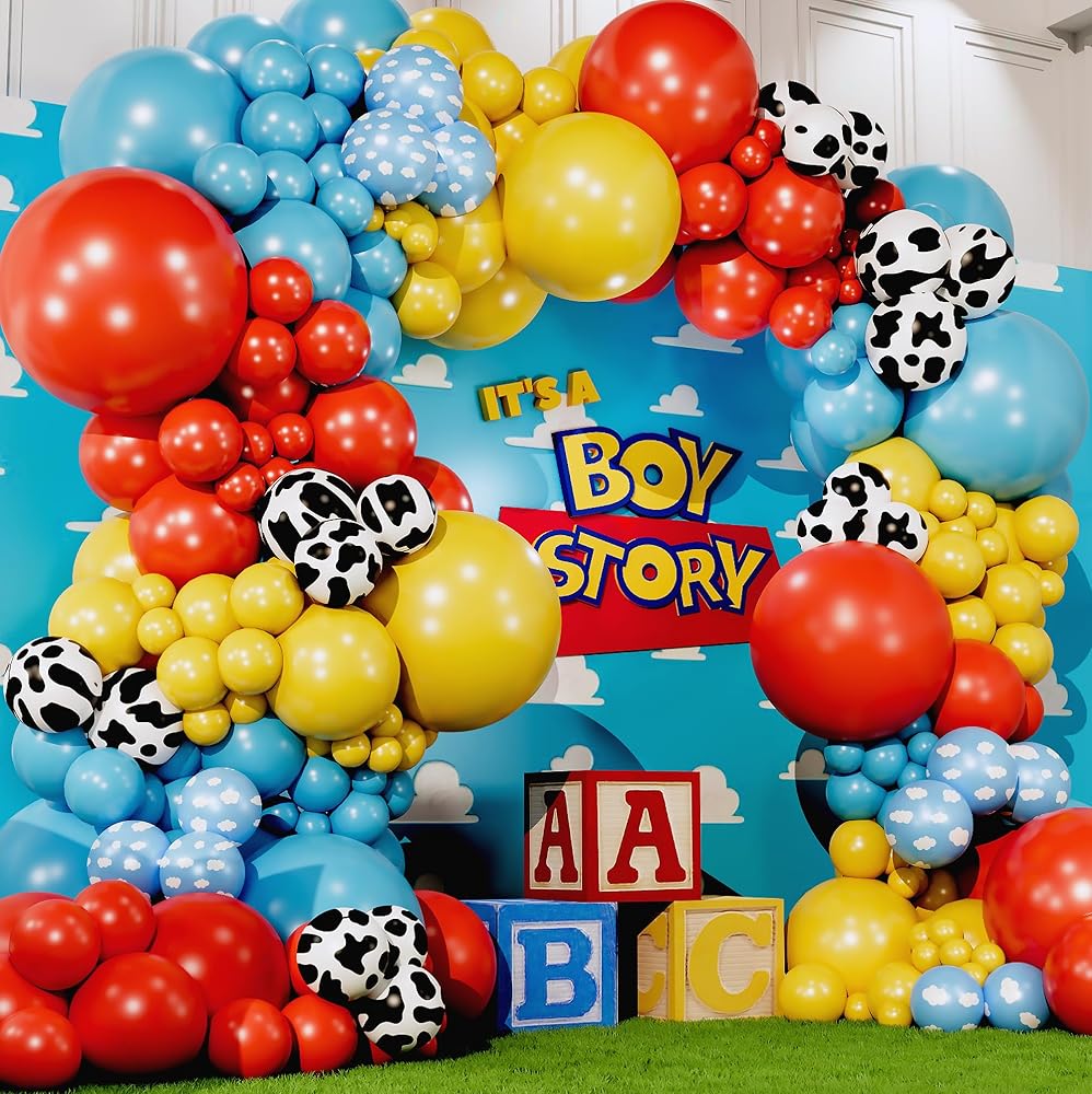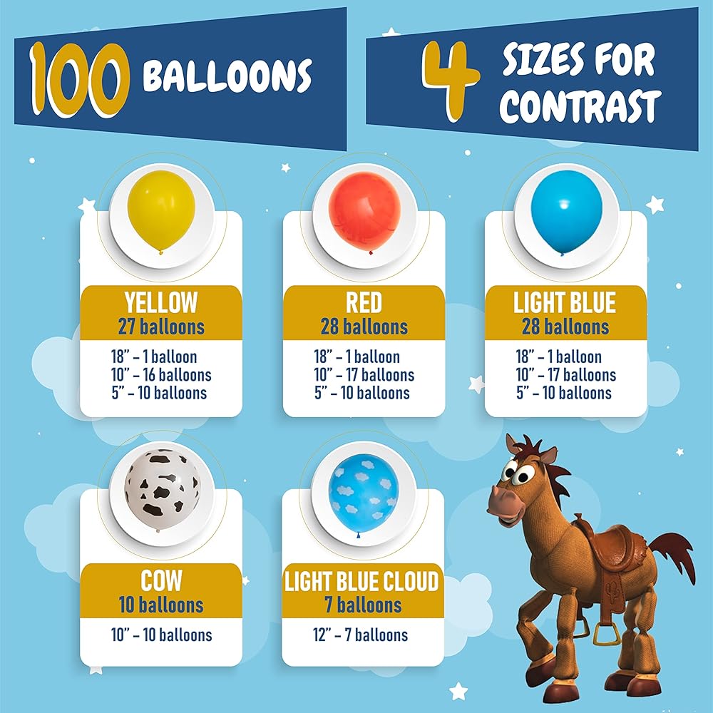 【EVERYTHING YOU NEED IN 1 KIT】Make your party come to life with a big beautiful balloon garland! Dress up your toy story party decorations or toy story baby shower decorations with this toy story balloon garland kit. Contains 100 red, yellow, blue, cow, & cloud toy story theme balloons and accessories all in 1 Kit. PLUS, you get Step-by-Step Instructions for creating your toy story garland. You will be shocked at how FAST and EASY it is to assemble, even if it's your 1st time!