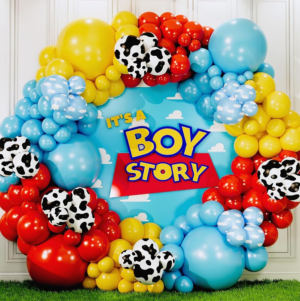 ALL-IN-1 Toy Story Balloons Arch Kit for It's A Boy Story Baby Shower Decorations – Toy Story Balloon Garland Kit with Cloud & Cow Toys Story Balloons for First Toys Story Birthday Party Supplies