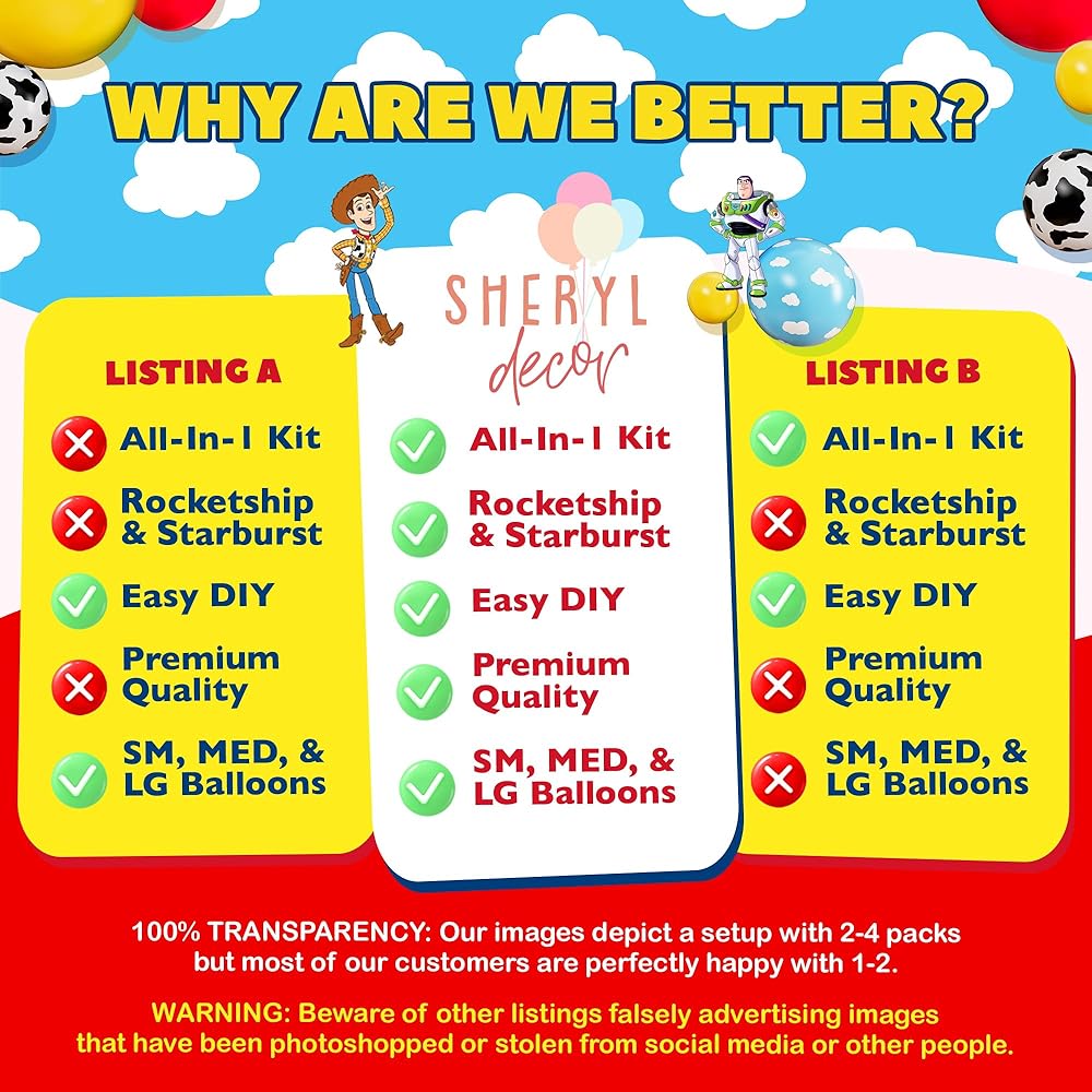 【GUARANTEED, OF COURSE】Any popped balloons? No Worries, message us and we'll send you a 100% REFUND or replacement ASAP! We understand your important event is right around the corner so when your toy story ballon arch arrives, check it and tell us if anything is missing. We'll replace it FREE OF CHARGE before the big event. Boy Story baby shower, Toy Story birthday balloons, Toy Story party supplies or just because… Make Your Party Come to Life, with Sheryl Décor.