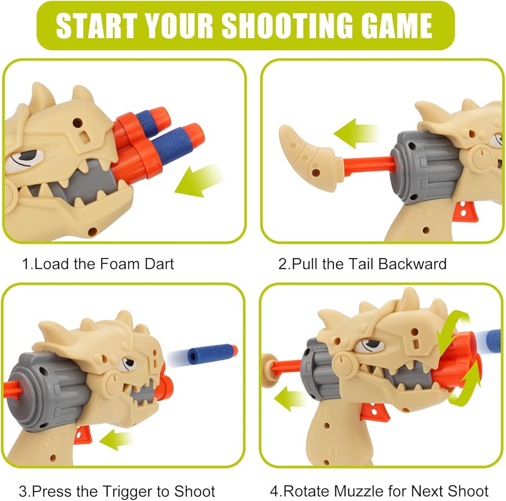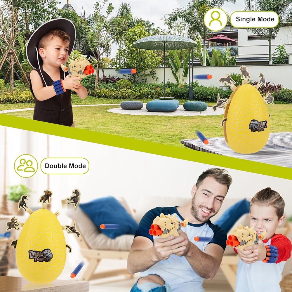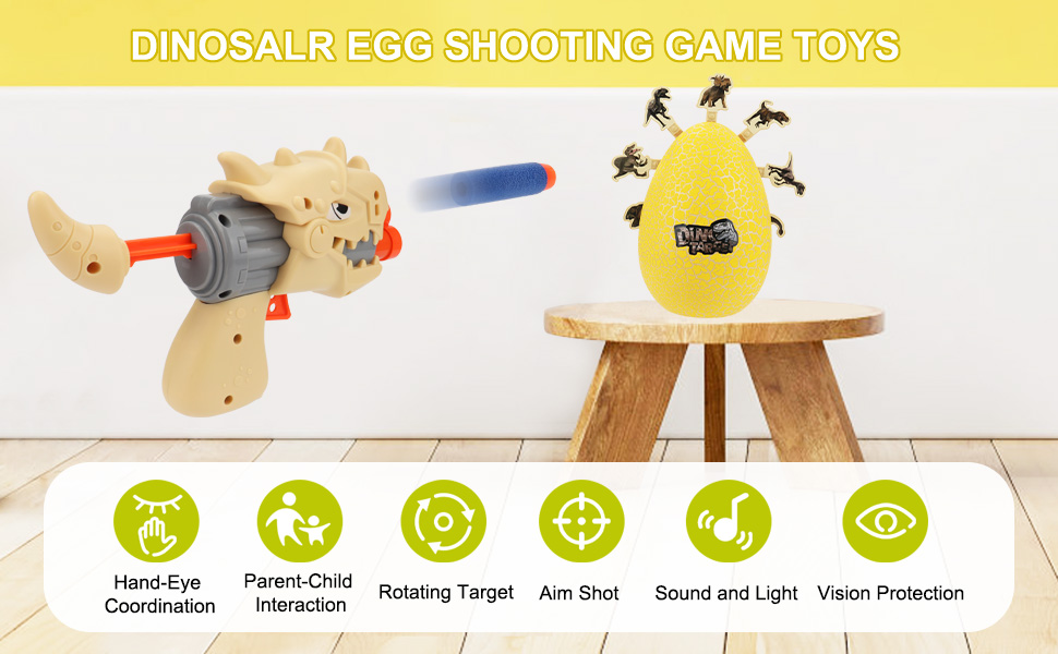 ➤【Great Shooting Game Toys 】- This dinosaur shooting toy comes with a 360° rotating dinosaur egg target, 2 dinosaur blaster guns, 16 soft foam bullets, 2 foam bullet bands, 8 dinosaur model stickers (stick on 8 dinosaur target) and user manual. The shooting toy is perfect for children aged 5 +, which can improve their hand-eye coordination, concentration and reaction ability.