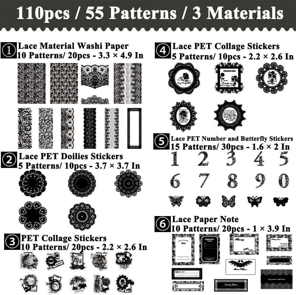 Great Value Lace Set - You will receive 110 pieces of scrapbook lace ephemera, featuring 55 unique patterns with 2 pieces for each pattern. This lace scrapbooking kit includes three different materials: 20 pieces of washi paper, 70 pieces of PET stickers, and 20 pieces of lace paper notes.