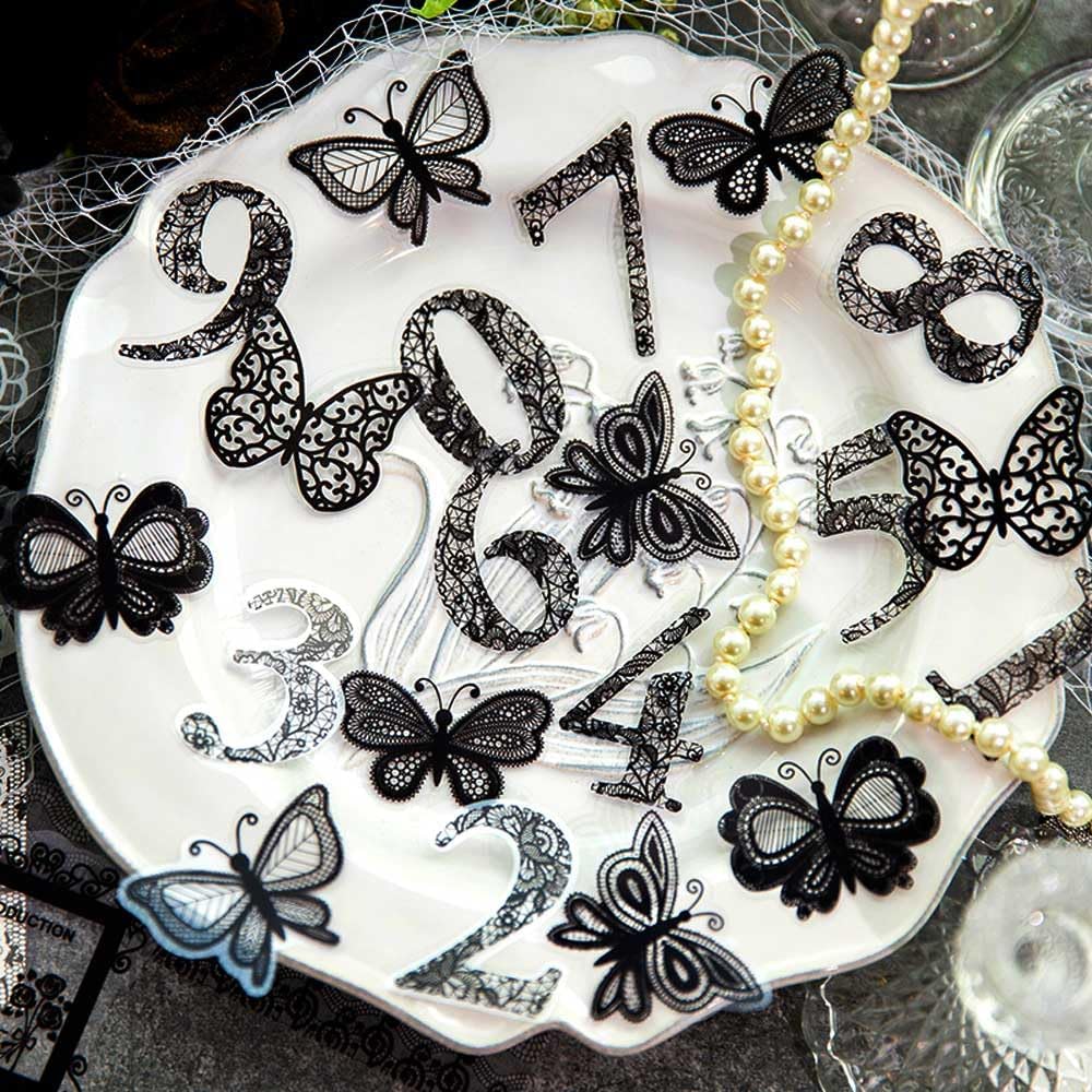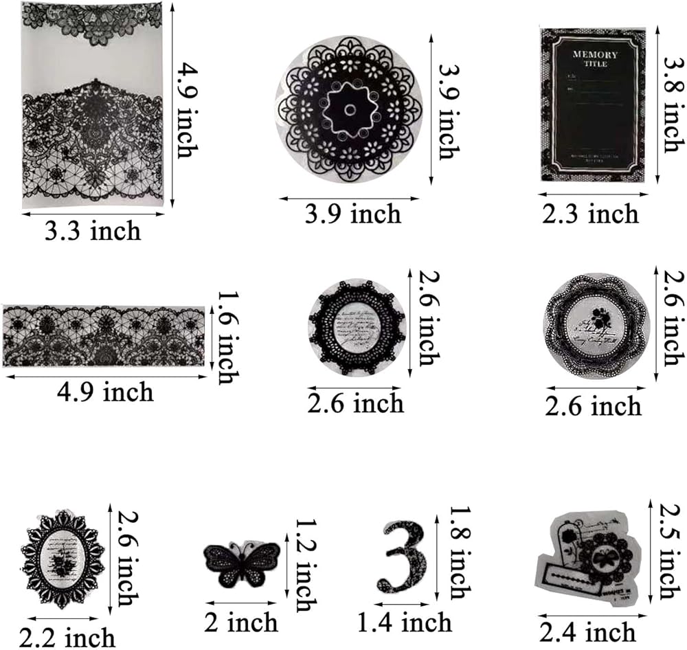 Various Sizes - Lace washi paper measures 3.3 × 4.9 inches, PET lace doilies stickers are 3.7 × 3.7 inches, collage PET stickers are 2.2 × 2.6 inches, lace PET number or butterfly stickers measure 1.6 × 2 inches, and lace light paper notes are 1 × 3.9 inches. Of course, you also can cut them to your desired size.
