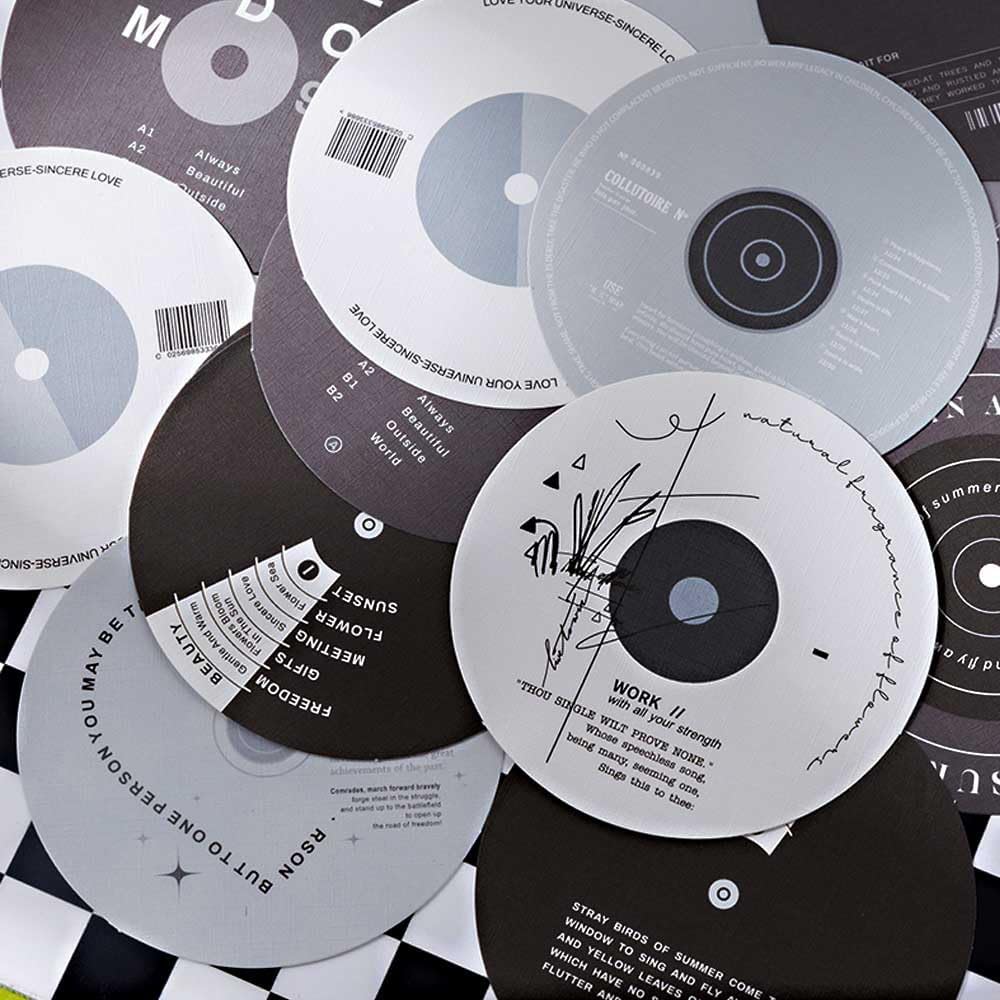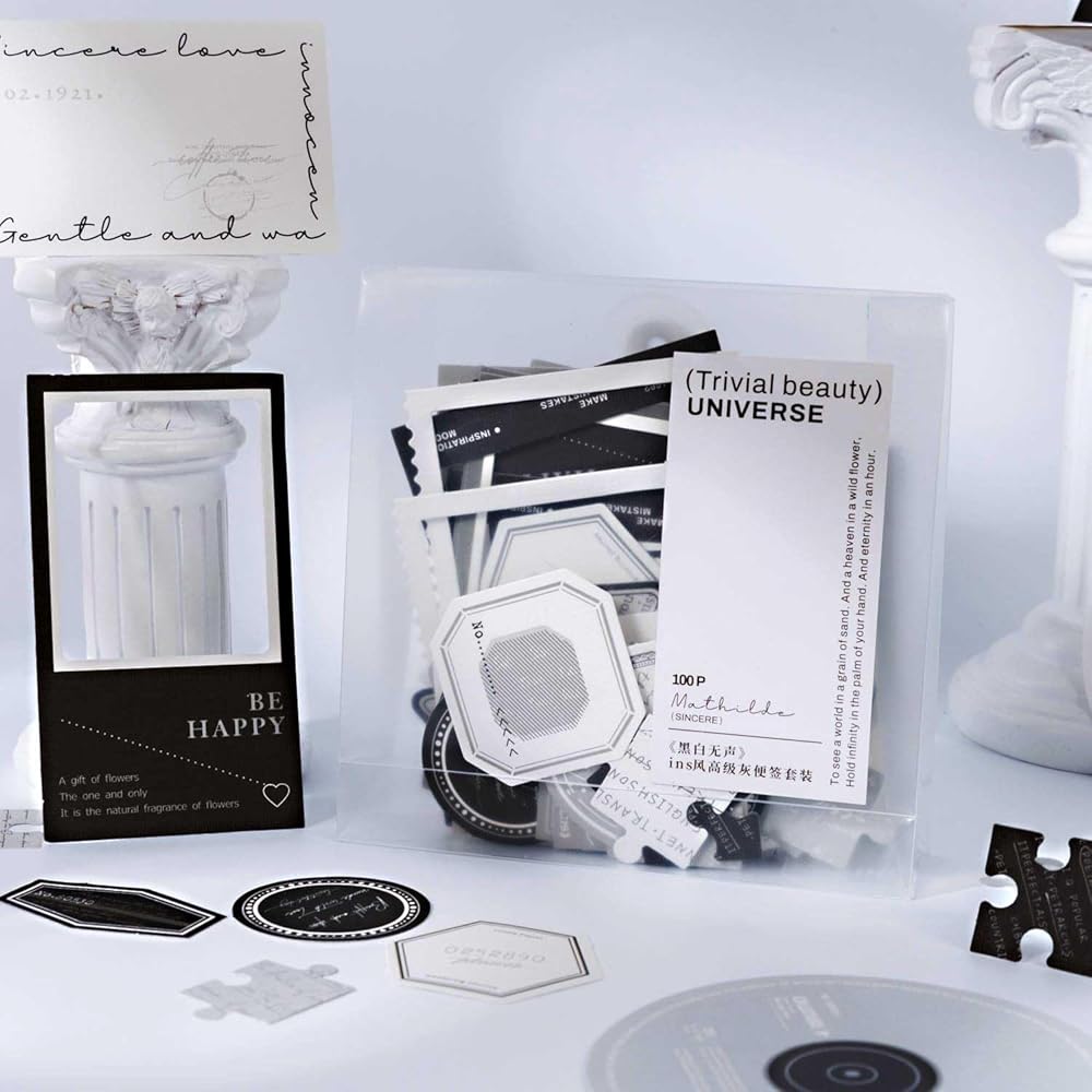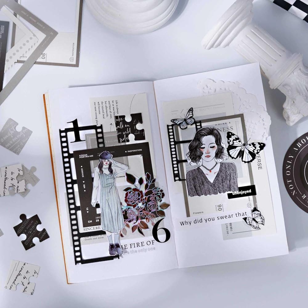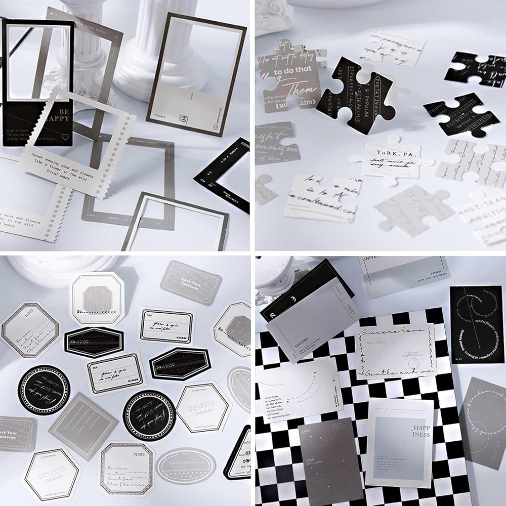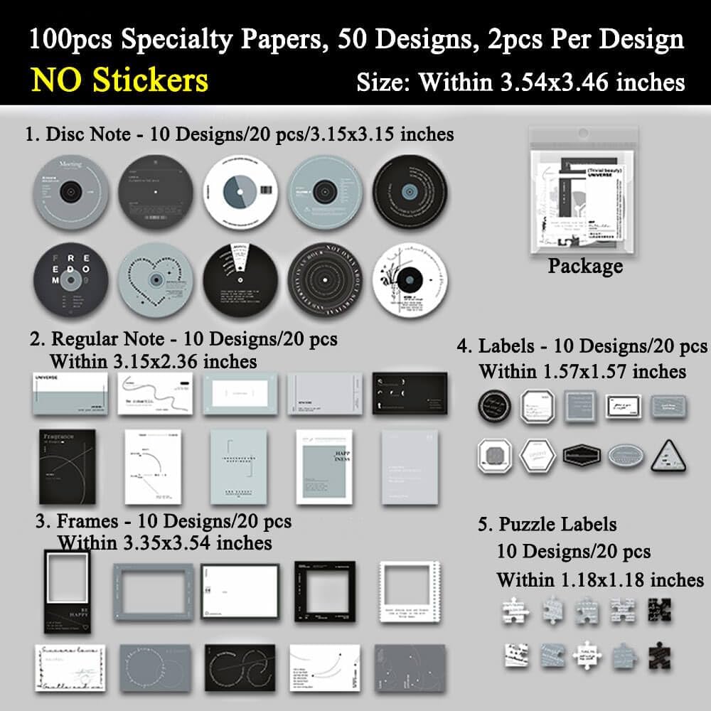 NO STICKERS - The white and black Scrapbook kit features 100 pieces of specialty paper with 50 unique designs, 2 sheets per design. The journaling set kit comprises record pad paper, standard notes, hollow frame, puzzle label, and additional small label.
