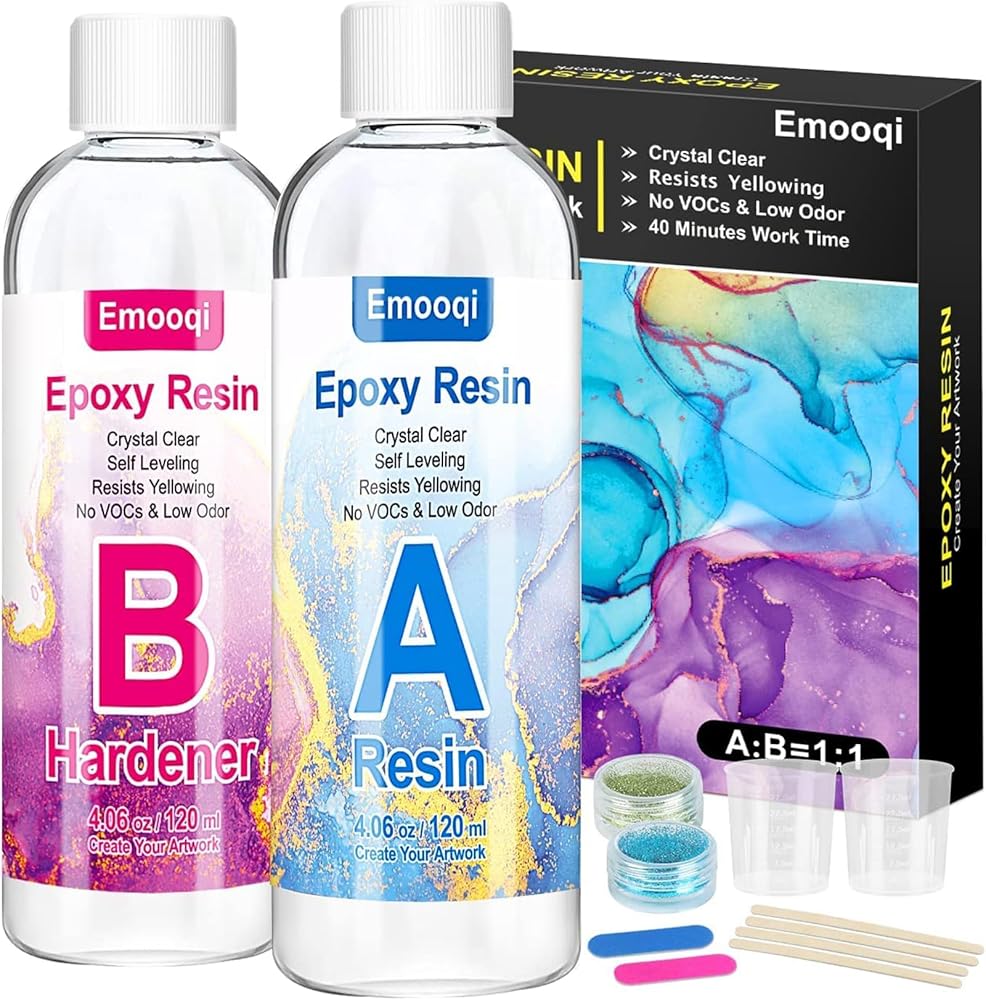 Epoxy Resin Kit, Emooqi 8.12 oz Epoxy Resin AB Set,Including Resin (4.06 oz) and Curing Agent (4.06 oz), 1:1 Ratio is Easy to Mix, Suitable for Jewelry, Arts, Crafts