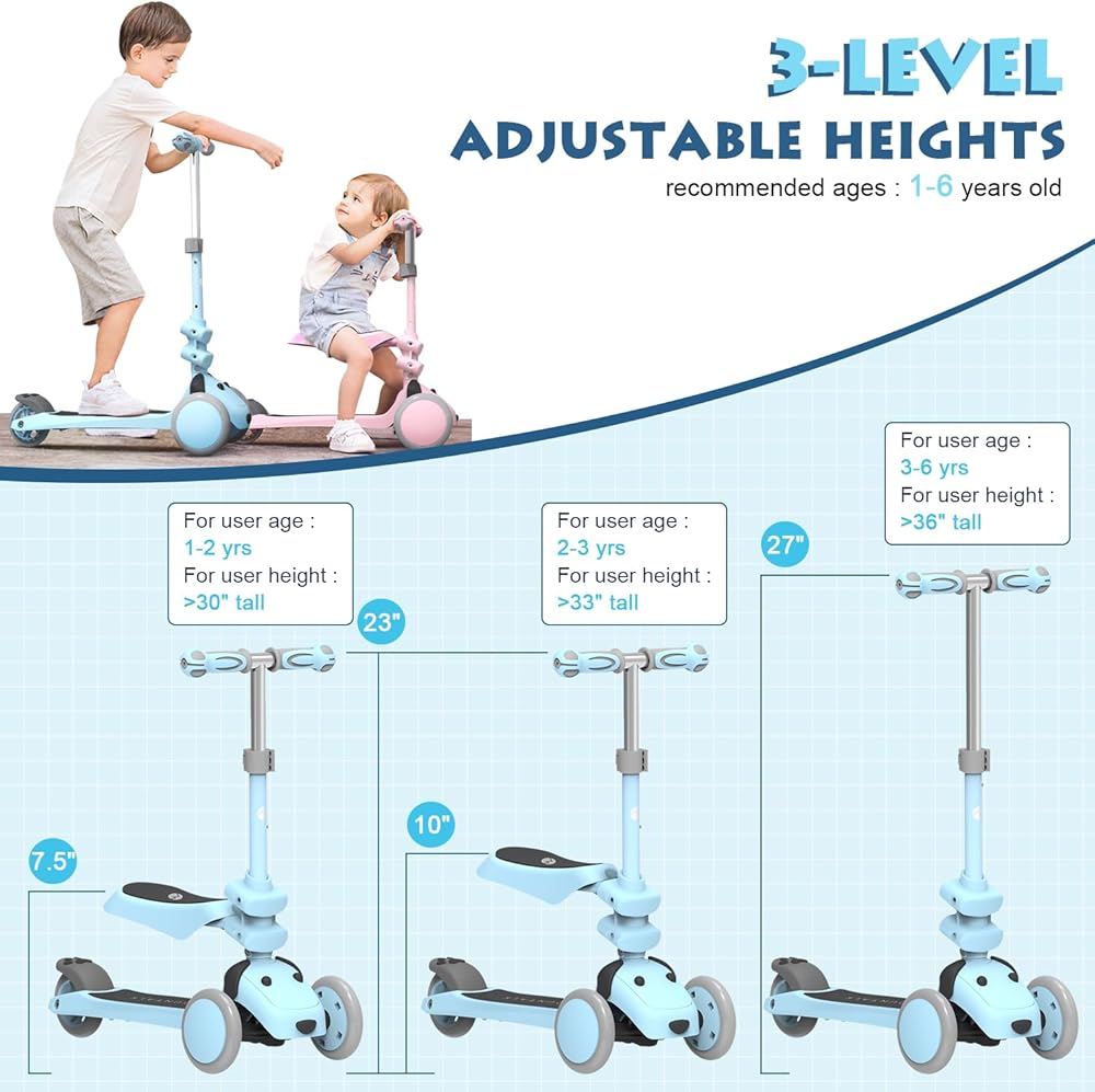 Easy To Adjust Height | The mini toddler scooter are easy to adjust and durable, which can grow up with your child and bring longer companionship. 2 height option ( Handle: 22.8“ / 26.7” Seat: 8.6" / 10.6" )