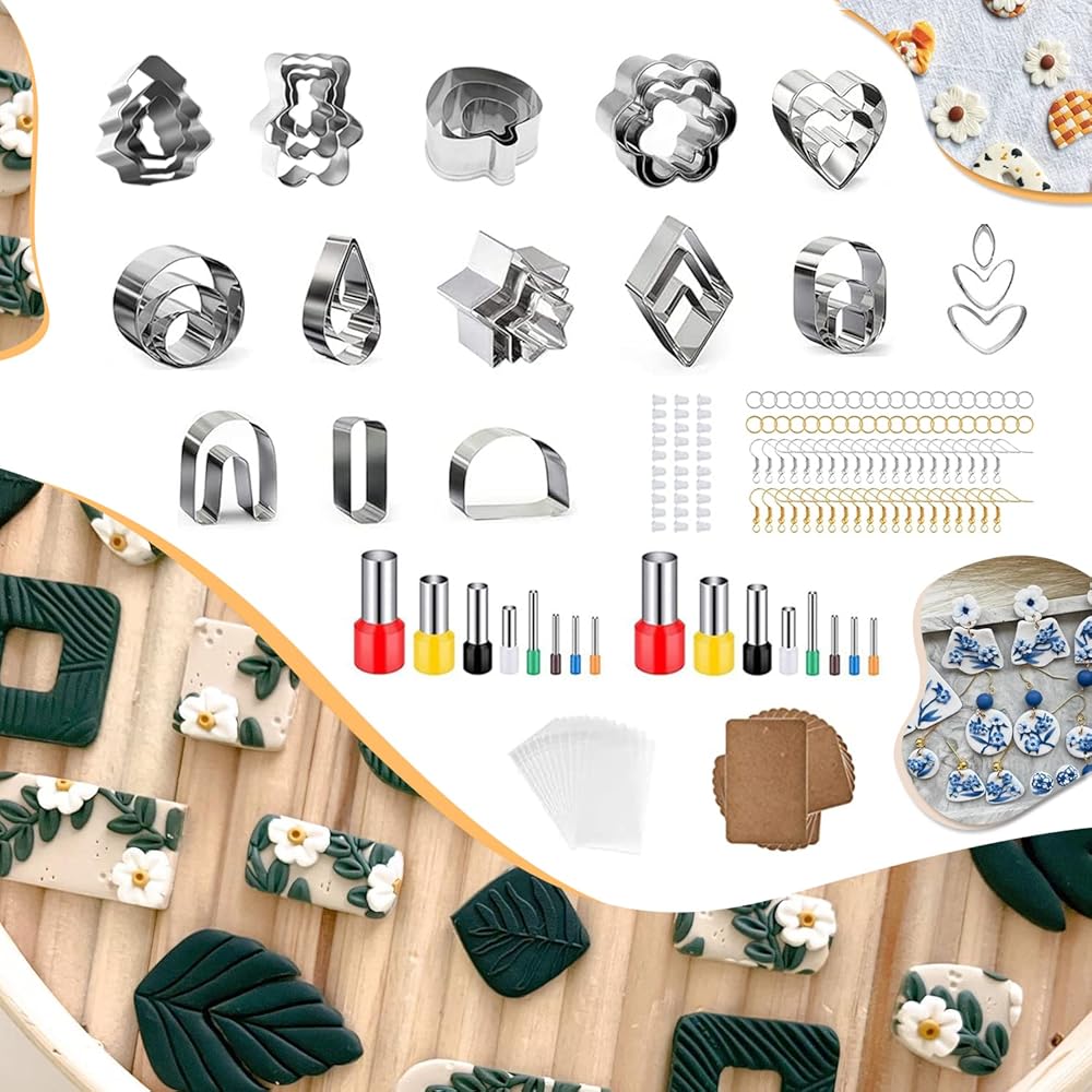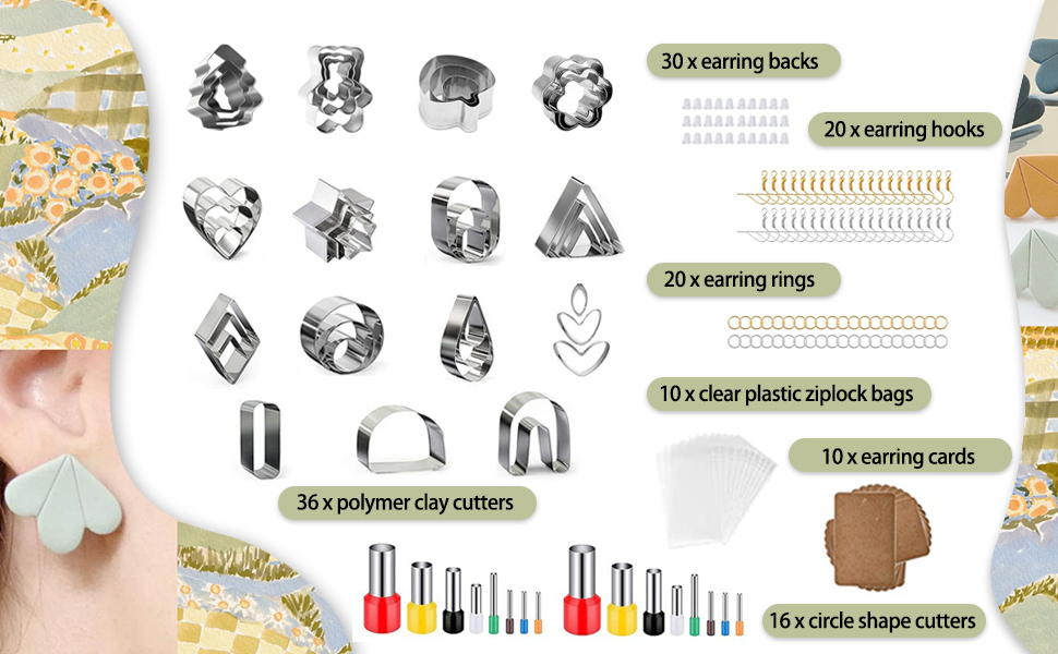 🥰◇Multiple Unique Shapes◇Houfamse polymer clay cutters set include 36pcs shape Stainless Steel clay cutters, 16pcs circle shape cutters, 20pcs golden & silvery earring hooks, 30pcs earring backs, 30pcs golden & silvery earring rings, 10 earring cards, and 10 clear plastic ziplock bags.