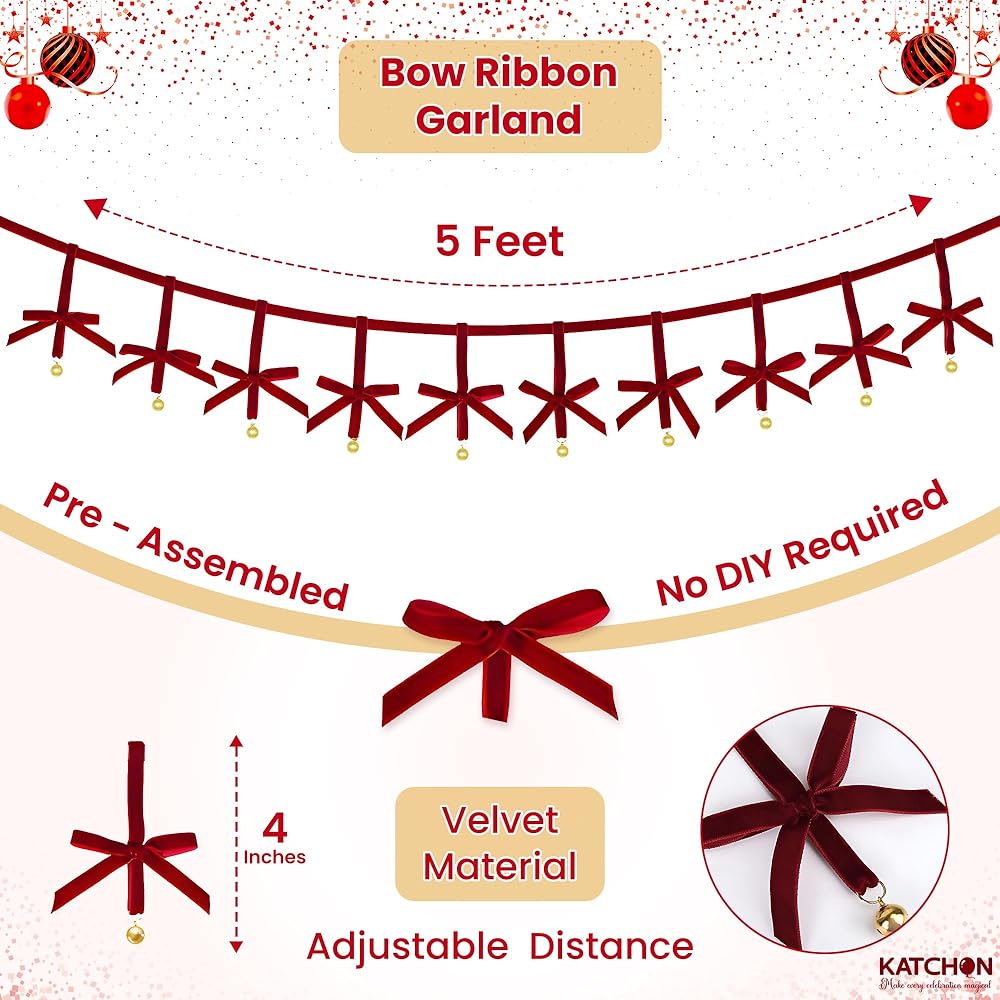 KatchOn, Christmas Garland Velvet Bows -5ft Pre-Strung | Christmas Decorations Indoor, Outdoor | Xmas Tree Banner with 10 Bows | Vintage Decorations for Tree Mantle Stair Party Wall Office, Red