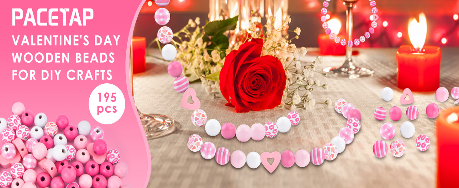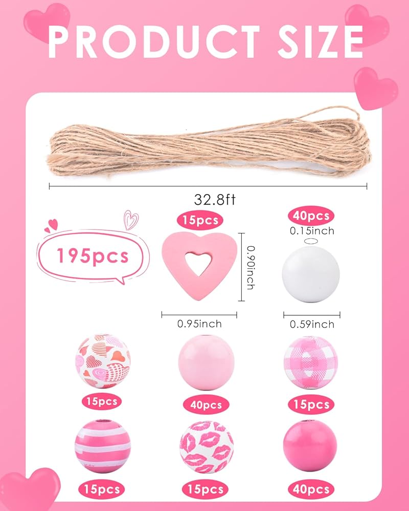 PACETAP 195Pcs Valentine's Day Wooden Beads with 32.8FT Hemp Rope, Hearts Beads Pink Red Round Colored Craft Beads for DIY Crafts Garland Wedding Memorial Day Anniversary Home Decor Party Supplies