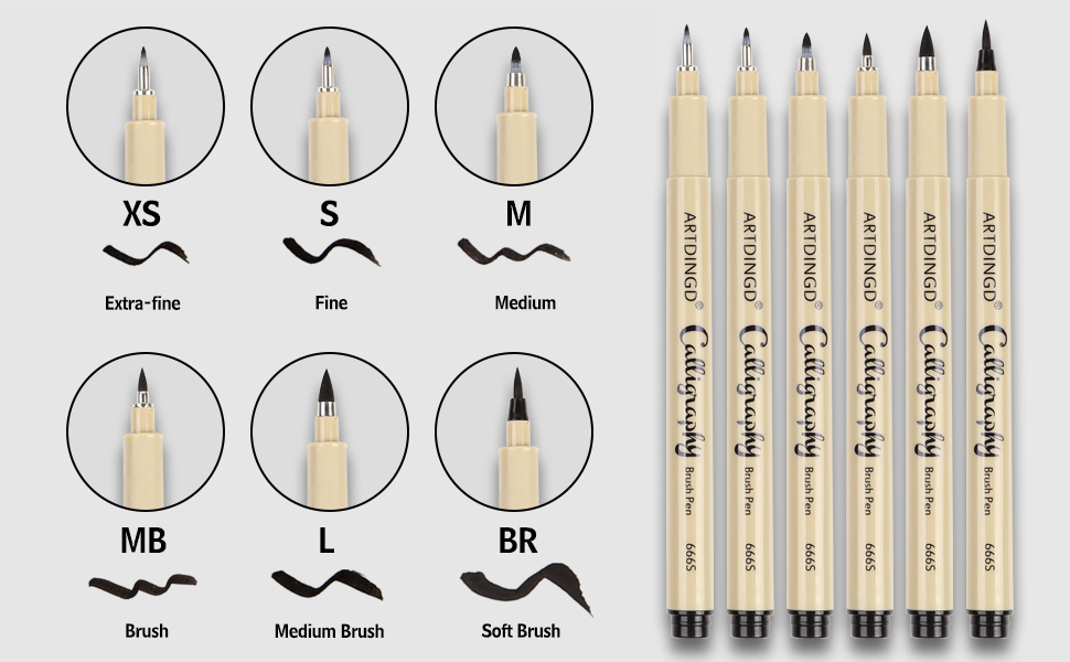 6 Size black Calligraphy Brush Pen Include: extra-fine, fine, medium, brush, medium brush, soft brush, best brush pens for calligraphy and lettering. you may use them for printable invitations, wall art, calendars and planners, blog designs, textile decor, invitations, scrapbooking projects and so many more!