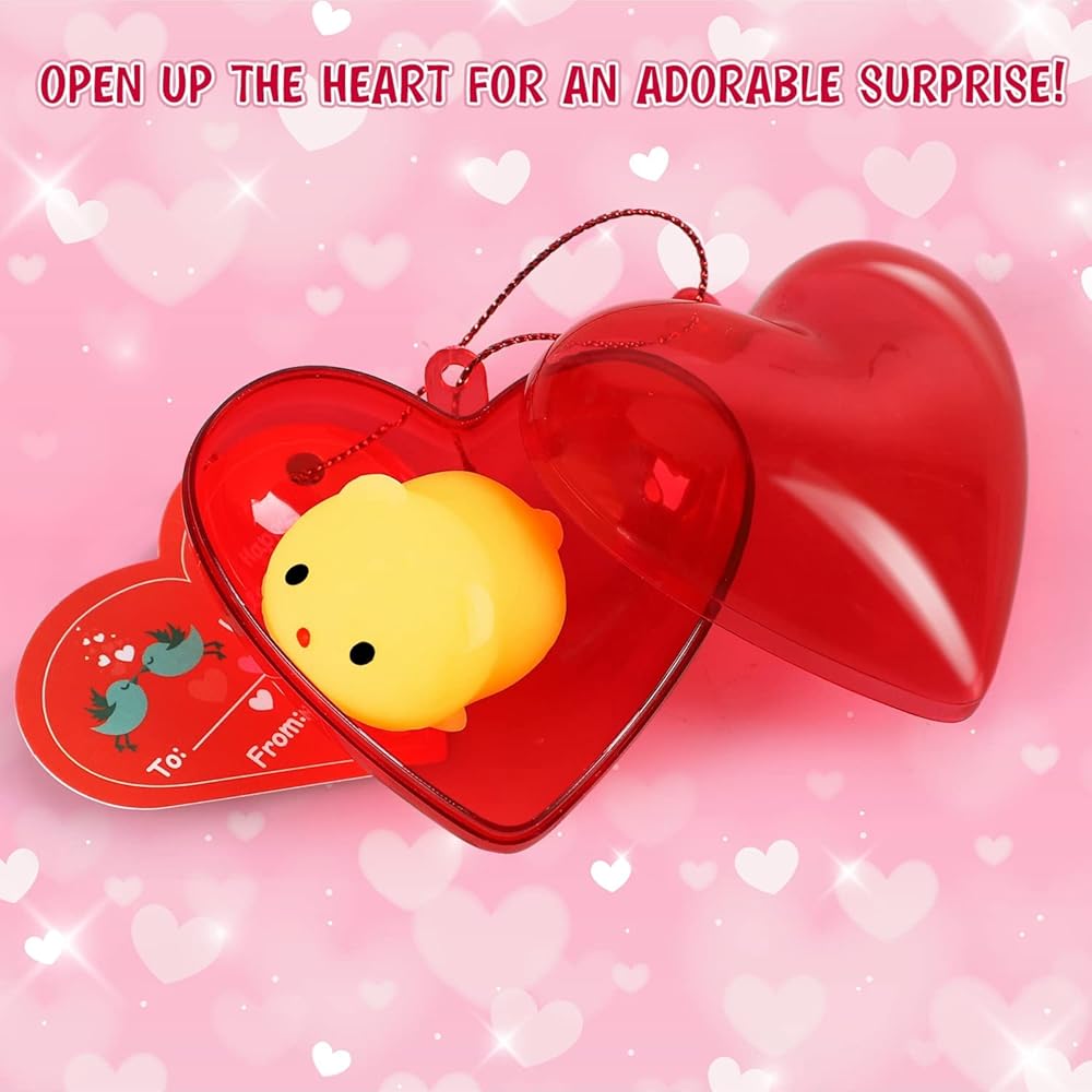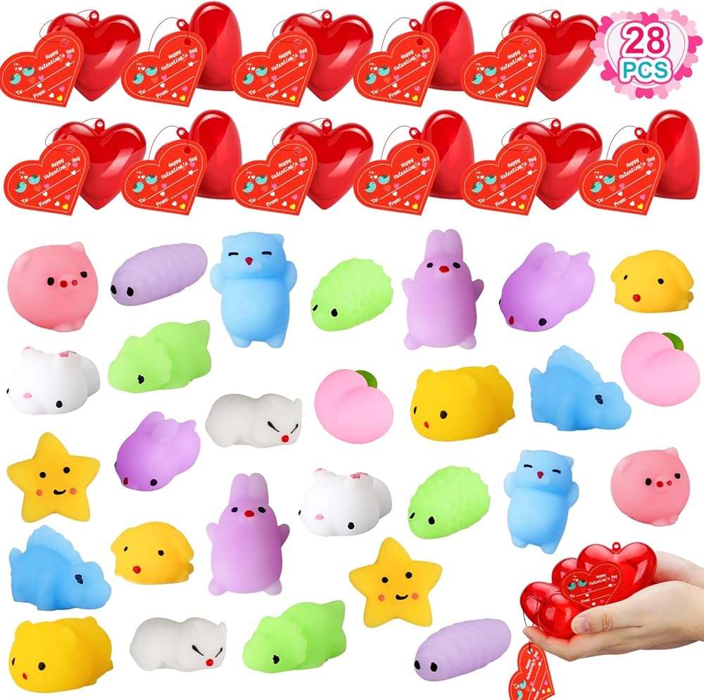 TOY Life Mochi Squishy Toys 28pcs Birthday Gifts for Kids Classroom with Filled Hearts & Birthday Cards Kawaii Squishies Fidget Toys for Party Favor Girls Boys