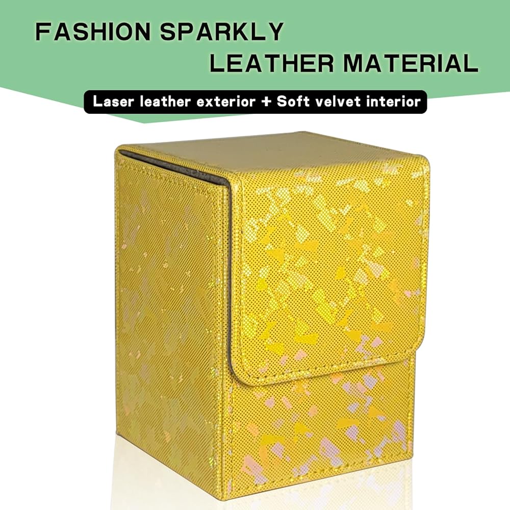 The vertical commander deck box is made of laser PU leather. It comes with 2 dividers. The box holds up to 100+ Standard size gaming cards with single sleeves or 180+ sleeveless cards. Fits all standard size trading cards such as football cards, baseball cards, poker cards, game cards, attack cards. Compatible with Magic the Gathering and other standard size card games, YuGiOh! and many more CCG, LCG and all your favorite TCG card games.
