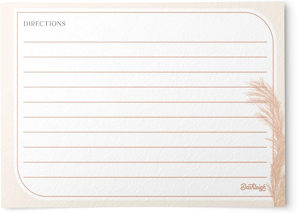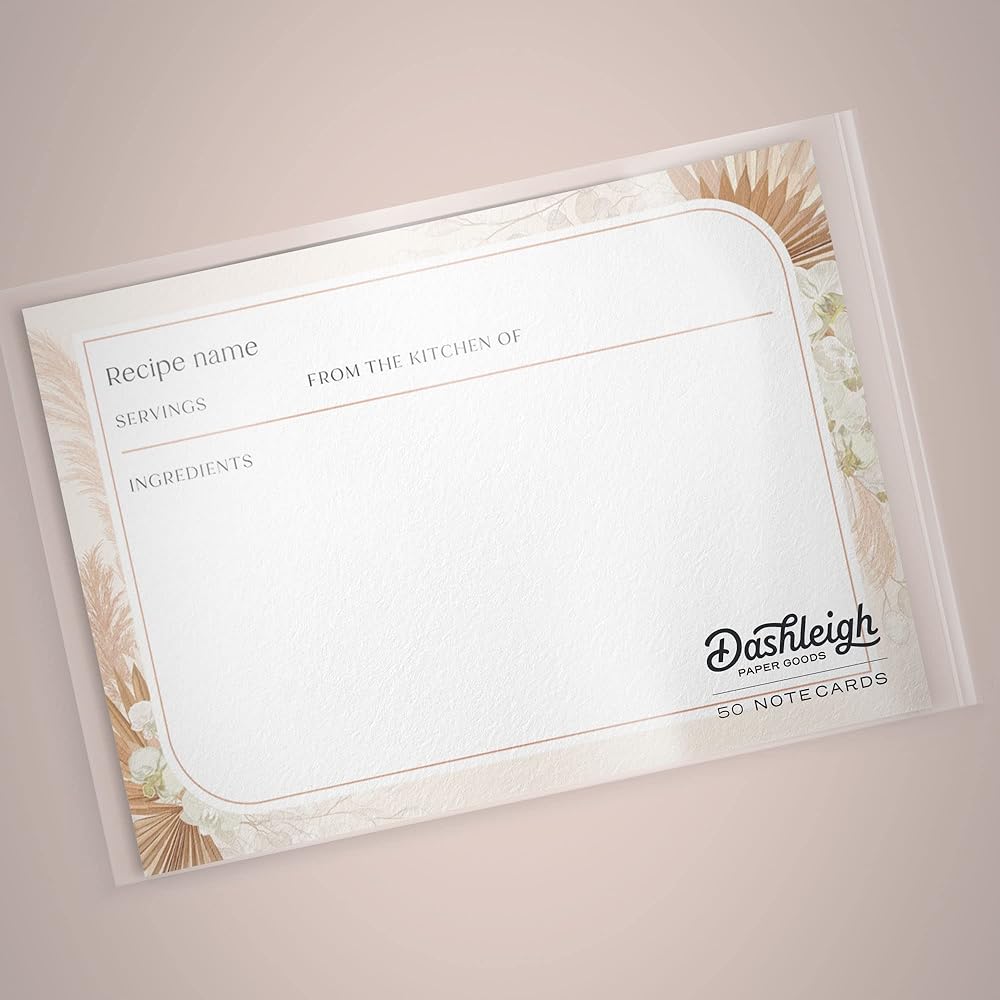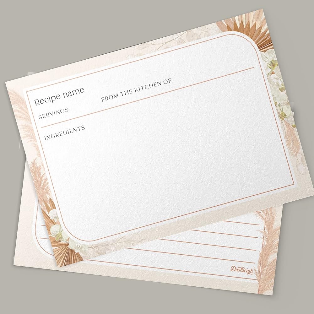 These gorgeous bohemian recipe cards features dried palm leaves, blush pinks and rust-colored rose, ivory protea, white ranunculus, and pale pampas grass. These premium recipe cards are made from heavy-duty 14pt cardstock. Printed with bold and vivid colors, these 4x6 inch cards make a perfect addition to any kitchen. Each set of 48 cards is printed on both the front and back, and packaged ready to gift.