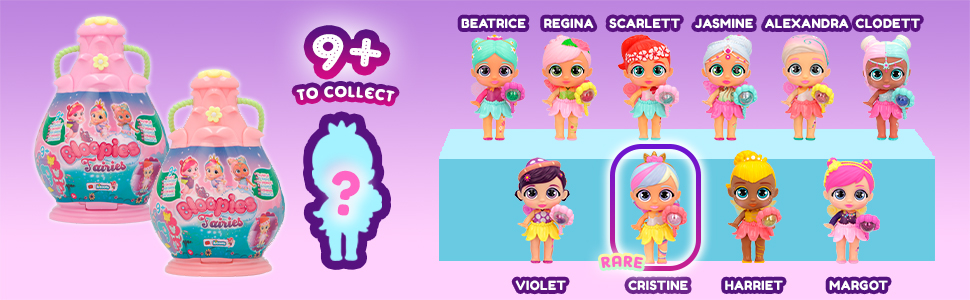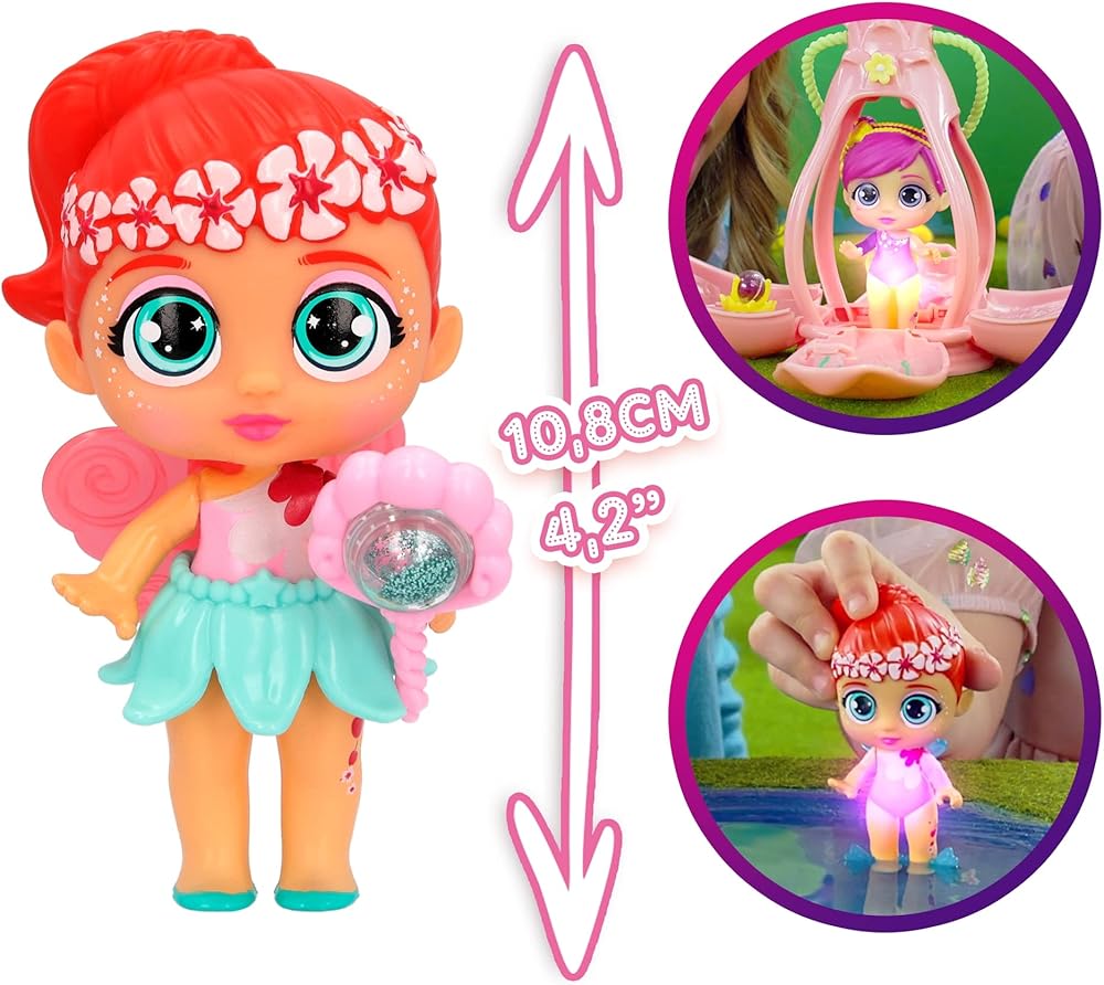 Bloopies Fairies are the collection of little dolls that live in a world full of magic! They come inside a flower-shaped lighthouse. Find the magic key, a butterfly that opens the flower petals where you will discover all her accessories: her wand, a glitter pearl, a skirt, 2 wings and fins, her personalized accessory related to her power and the special pearl! Fairies are very magical and their bodies light up. The light turns on when you put your fairy inside the flower or in contact with water. There are 2 capsule colors and 9+1 characters to collect find the rare one with special finishes! Can you find them ALL?!?!