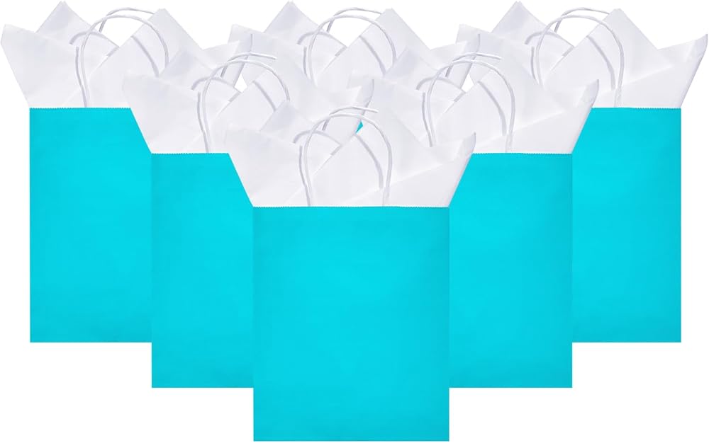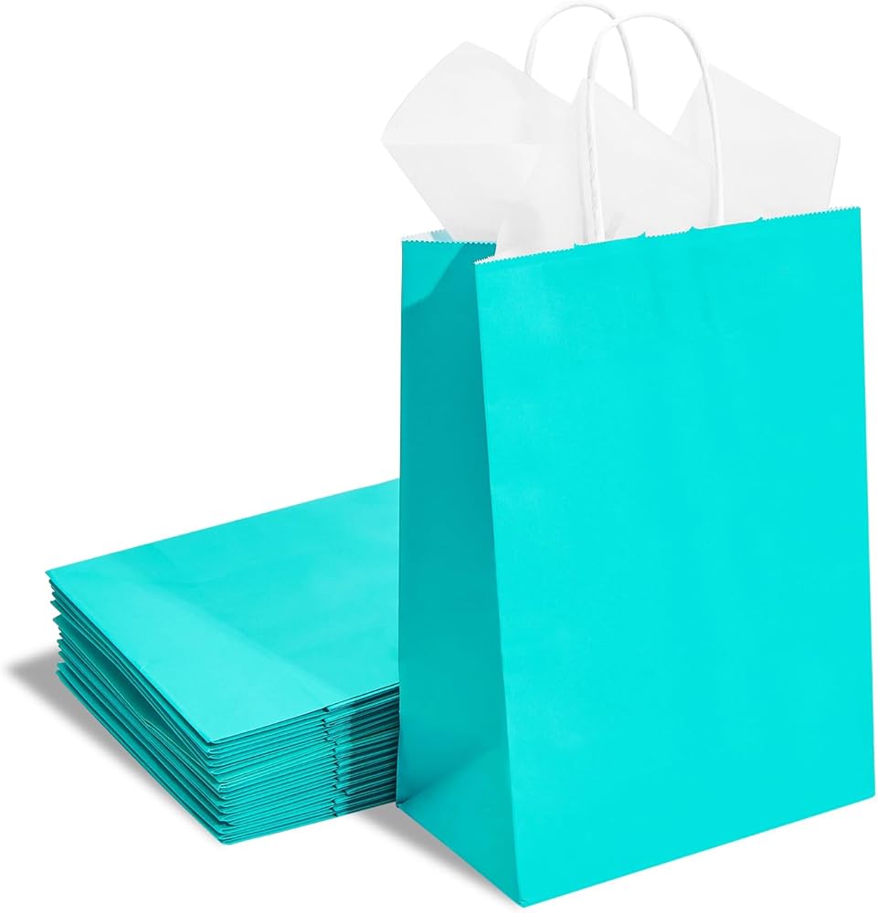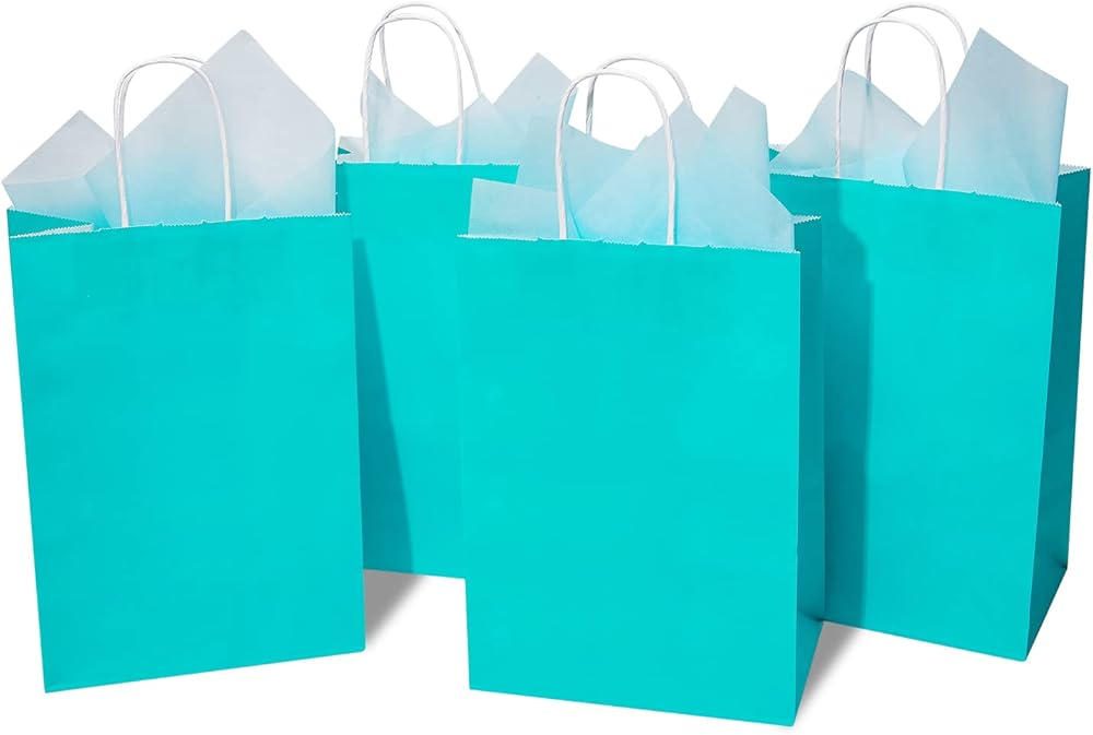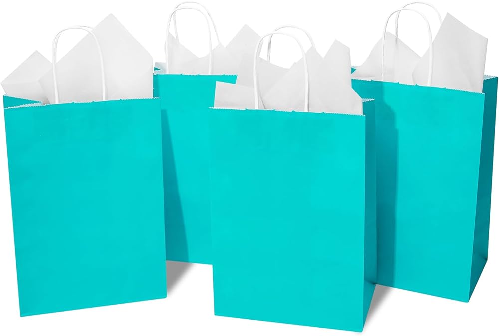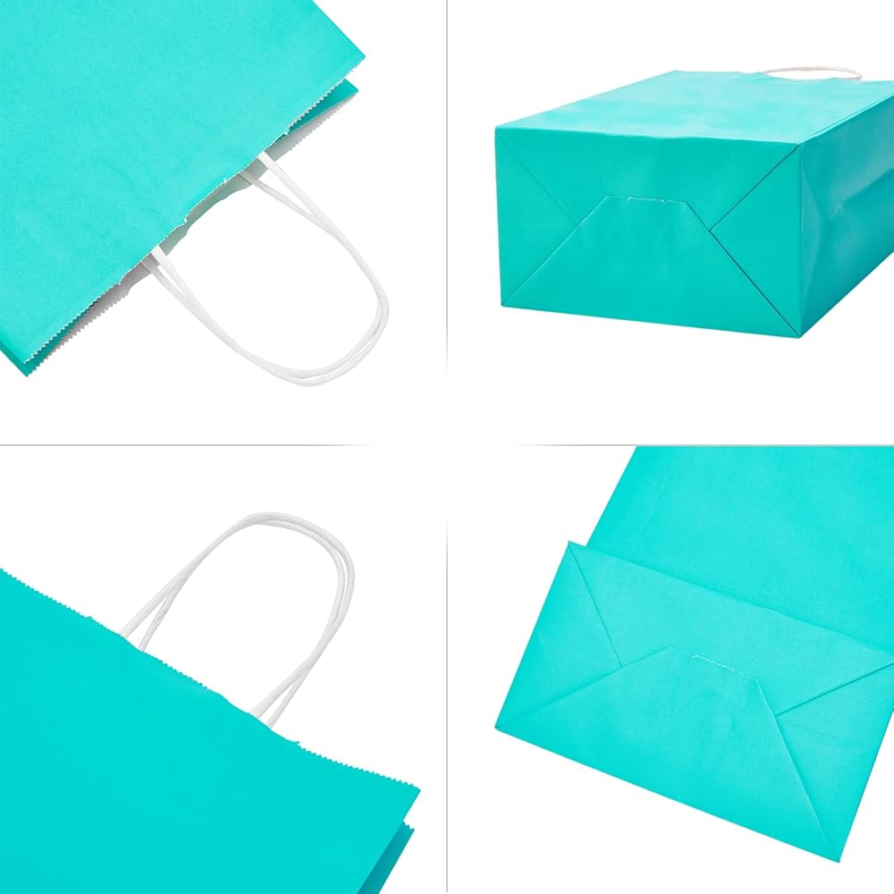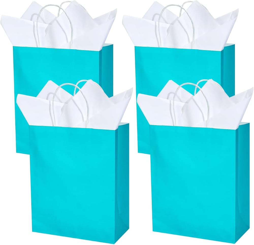 DjinnGlory 24 Pack Medium Size Teal Blue Paper Gift Bags with Handles 10x8x4 Inch and 24 Tissue Paper for Birthday Wedding Baby Bridal Shower Party Favors, Merchandise Shopping Bags