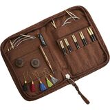 The needle tips of these interchangeable circular needles are made of Ebony, one of the world's most expensive wood. The liquid-silk finish on the lightweight needles, plus the 24K gold finish on the brass connector guarantees snag-free knitting. The smooth cords ensures no twist and lies flat when stored. Smoothly honed and shaped needle tips work well with all yarns. This package contains one pair each of interchangeable tips in sizes 3/3.25mm, 5/3.75mm, 6/4mm, 7/4.5mm, 8/5mm, 2 swivel cords and 2 fixed cords each in 16- and 20-inch lengths, 4 wooden end caps, 2 tightening tools, 5 colorful tassel stitch markers, and a silk case with embroidered floral motif. Imported.