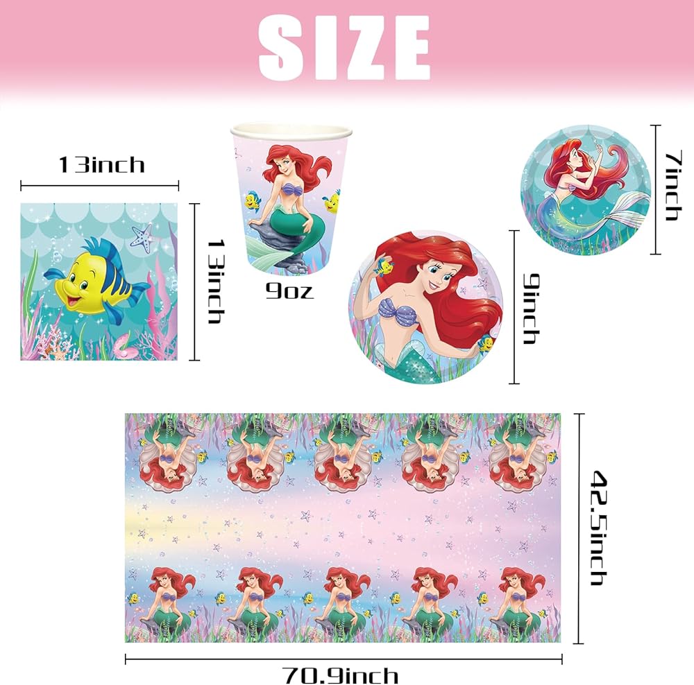 مجموعة لوازم حفلات ارييل بتصميم حورية البحر الصغيرة من جي كيه اس زاجو، تخدم 16 ضيفًا لحفلات حورية البحر الصغيرة، بما في ذلك اطباق واكواب ومناديل ومفرش طاولة لتزيين حفلات اعياد الميلاد للاولاد والبنات