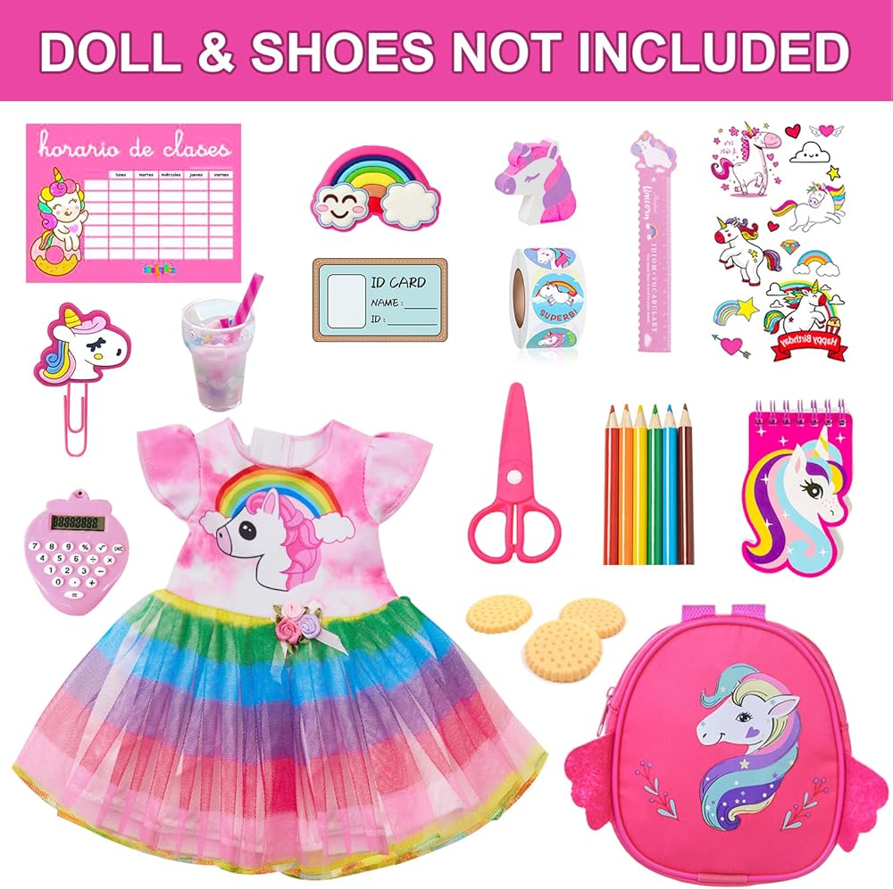23 Pcs Doll School Supplies Accessories Playset for 18 Inch Doll Including American Doll Clothes, Bags, Student Cards, Sticker, Pencils, calculator, Scissors, notebook, etc