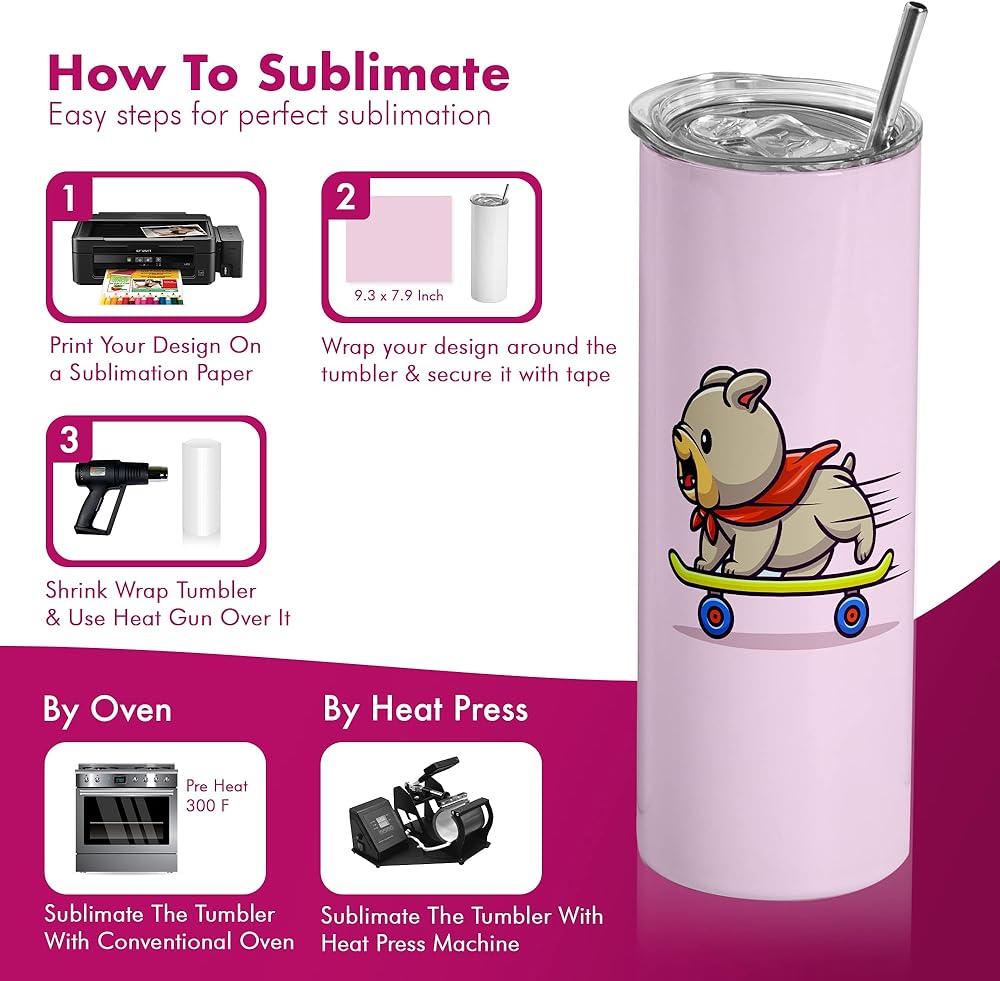 التصنيع سهل: صمم الأكواب الفنية باستخدام أكواب التسامي سعة 20 أونصة، فارغة وبيضاء وجاهزة للصناعة باستخدام آلة الضغط الحراري (334 درجة فهرنهايت لمدة 50 ثانية) أو فرن التسامي أو الحمل الحراري (300 درجة فهرنهايت لمدة 6 دقائق). استخدم غلاف الانكماش التسامي للحصول على أفضل النتائج.