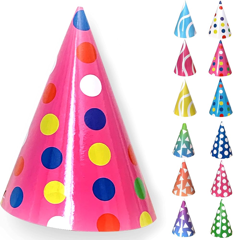 Elegantly packaged: Boxed 12 fun colorful cone party hats in various attractive color/pattern designs ready to create party mood sprit and atmosphere.