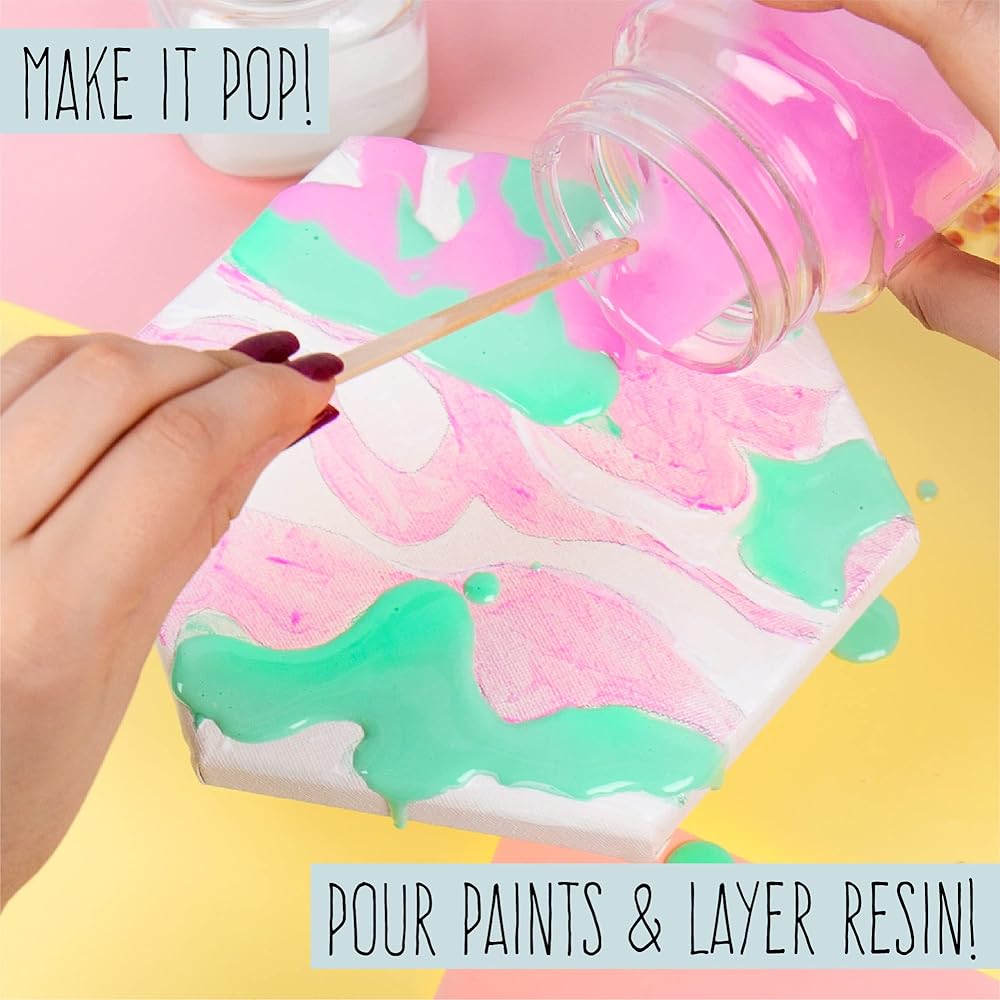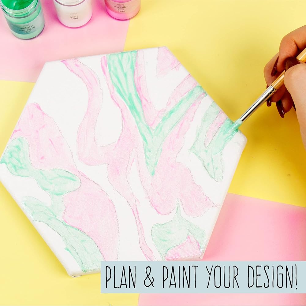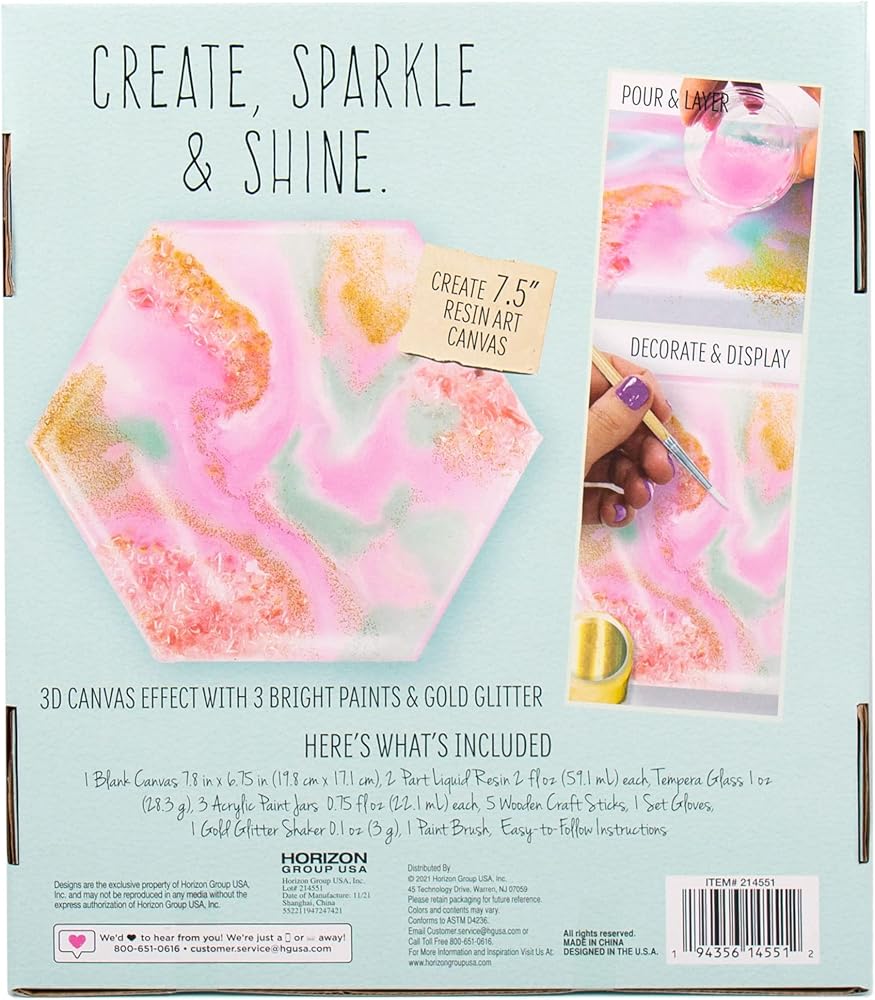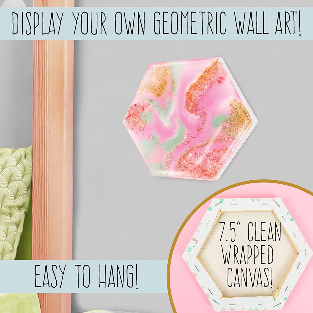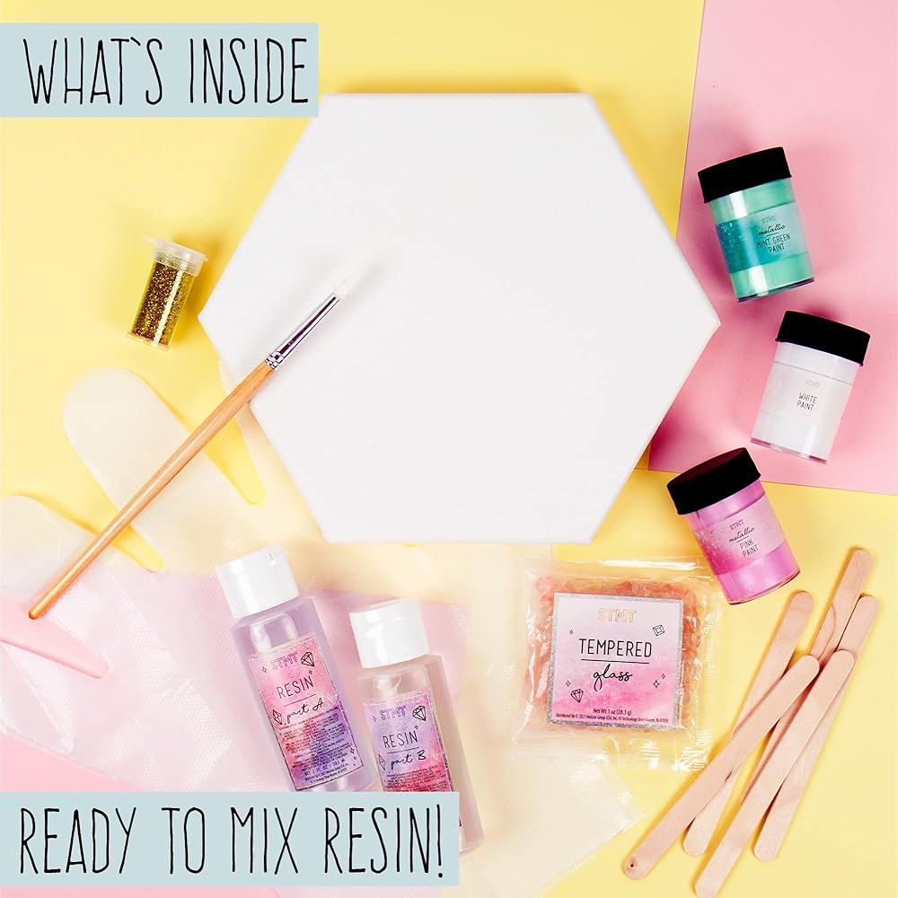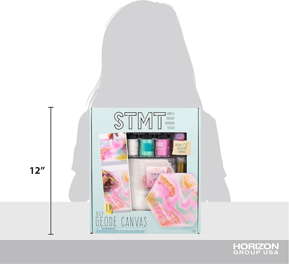 With the STMT D.I.Y. Geode Canvas set, you can elevate any space with contemporary wall art — inspired by the beauty in nature, designed by you! Using metallic paints, liquid resin, crushed tempera glass, glitter, and a few mixing sticks, you'll transform the blank, hexagonal canvas into a vibrant, geode-inspired work of art. Find a cozy space in a well-lit area where you can disconnect from the outside world and connect to the art you're creating — decide which areas of your canvas you'd like to paint and add the glass chips. Put paintbrush to canvas — add sweeps of metallic pink, dashes of teal hues, and crisp white details. Don't be afraid to let your colors blend, the most beautiful geodes in nature are known for their unique patterns and color combinations — make your art extra realistic by mixing paint colors! After painting your patterns, you'll use them as a guide for your liquid resin — pour the resin onto the canvas, matching the colors to the areas you've already painted. Then, sprinkle on the glass chips to create a geode-inspired texture — sealed by a clear top coat of resin. When your canvas dries, put display it wherever you please — prop it on a bookshelf or hang it on a wall! The STMT D.I.Y. Geode Canvas Set is perfect for any aspiring artist ages 14 & up.