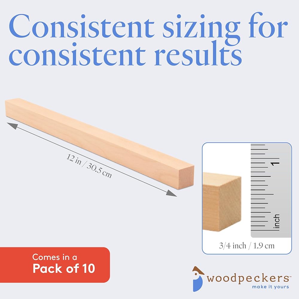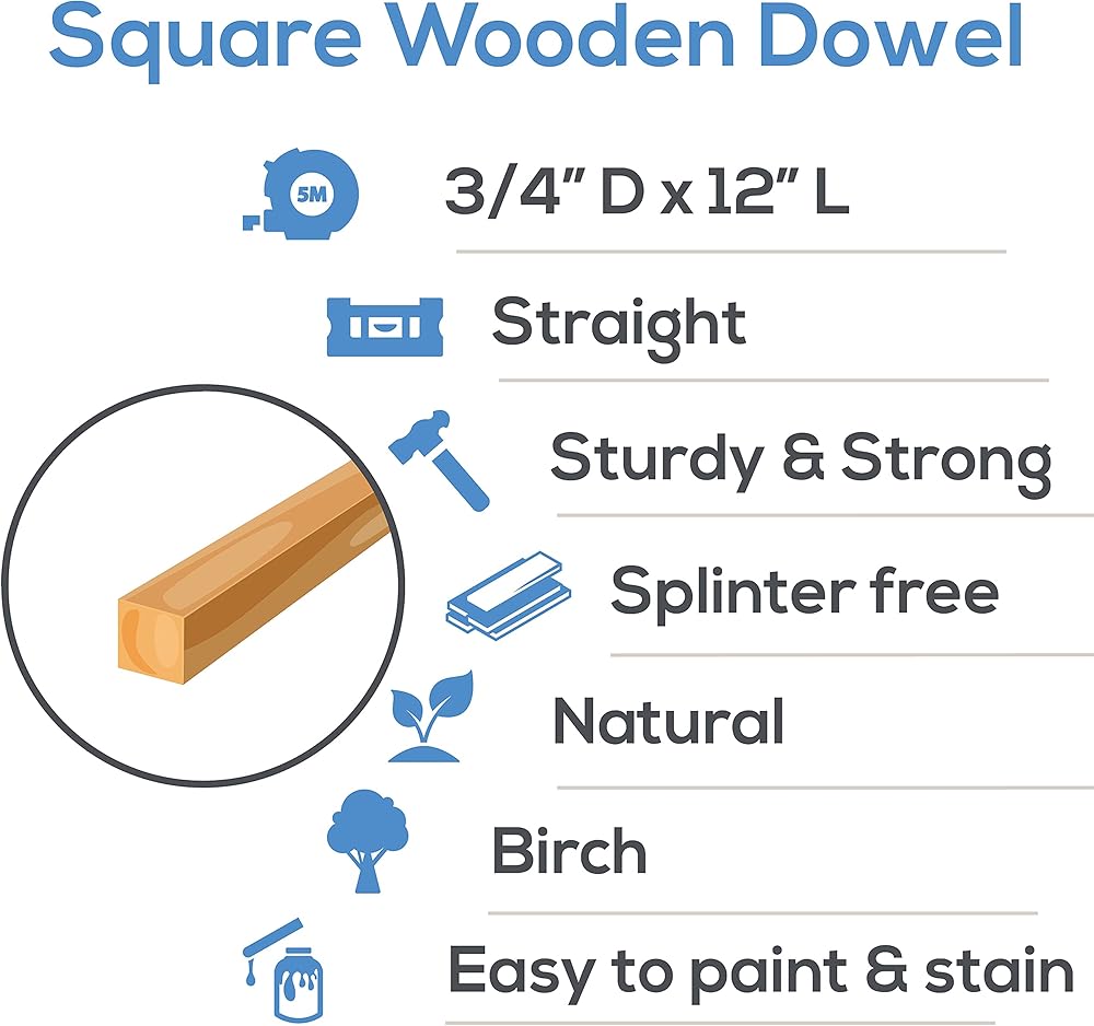 Woodpeckers Birch/poplar Wooden Square Dowels 3/4 inch x 12 inchIf you like your wooden dowels square... you'll love our wooden dowel rods! They are -· Hardwood - our hobby wood dowels are made of solid hardwood birch/poplar· Straight and smooth - At sturdy but not too heavy 3/4" x 12", they're ready to use right out of the bag· Beautifully unfinished - our square wood rods have a light and beautiful grain. They're beautiful enough to leave as-is, and are easy to paint or stain.