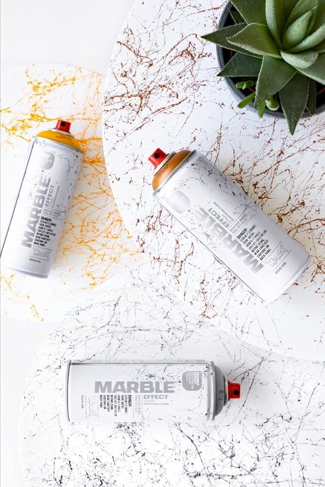 MARBLE Effect is high-covering spray paint for a deceivingly realistic marble effect. It can be used on many different surfaces such as paper, cardboard, primed canvas, wood, glass, metal, ceramics, porcelain, stone, acrylic, and other paintable materials. The marble effect is formed by very fine colored paint strands on the surface area of the object in question. The area which is to be sprayed is not entirely covered and will stay partially visible. The MARBLE Effect range consists of 10 inspiring colors. MARBLE Effect can be top-coated with many common lacquer types once thoroughly dry and the can is fitted standard with the FLAT JET WIDE calligraphy cap that can be adjusted to create spray output lines in vertical, horizontal, or variations thereof.